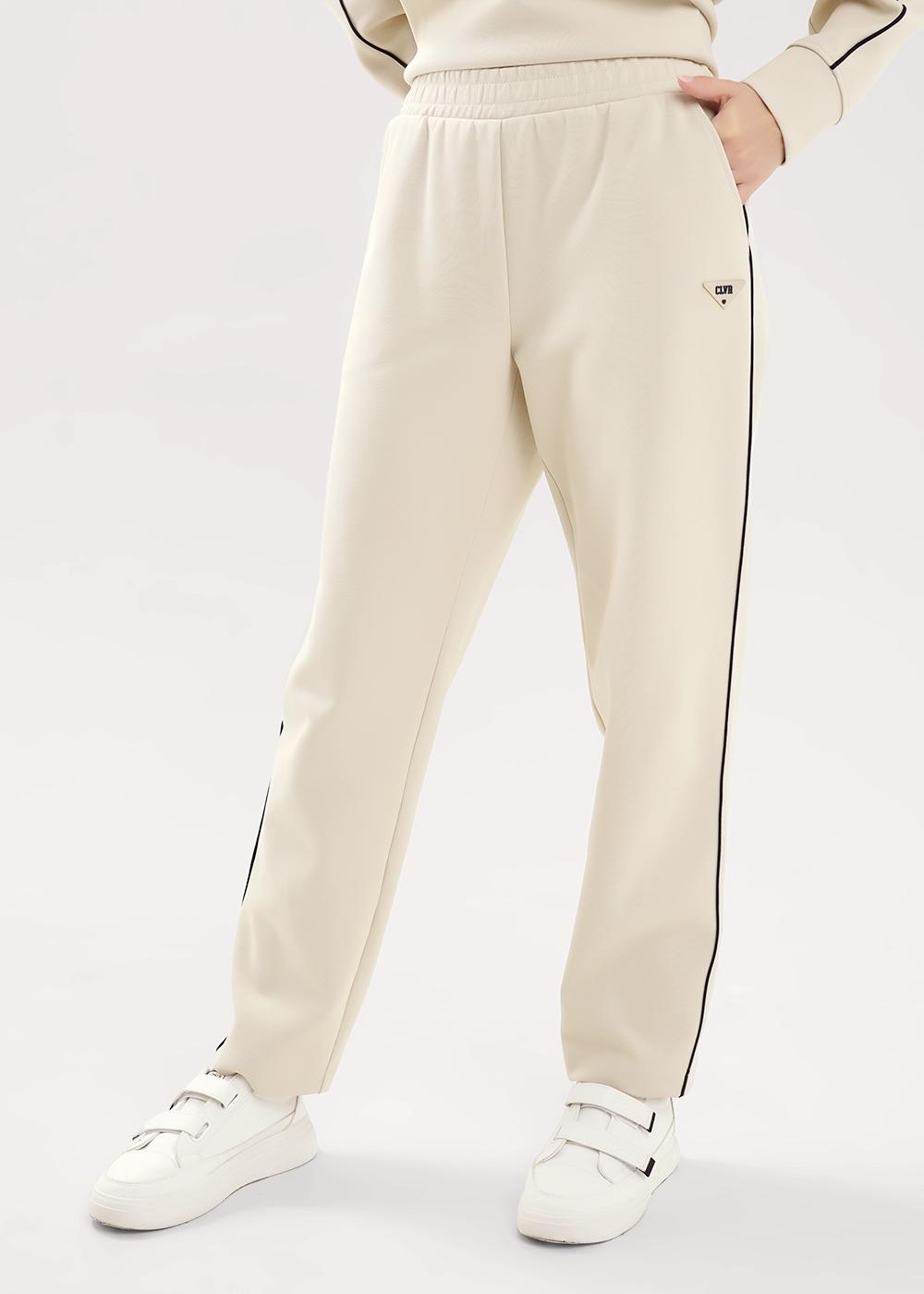 Брюки спортивные из трикотажного полотна, зауженные. Притачной пояс на внутренней резинке. Боковые карманы с отрезным бочком, нашивка. По боковому шву контрастный кант.