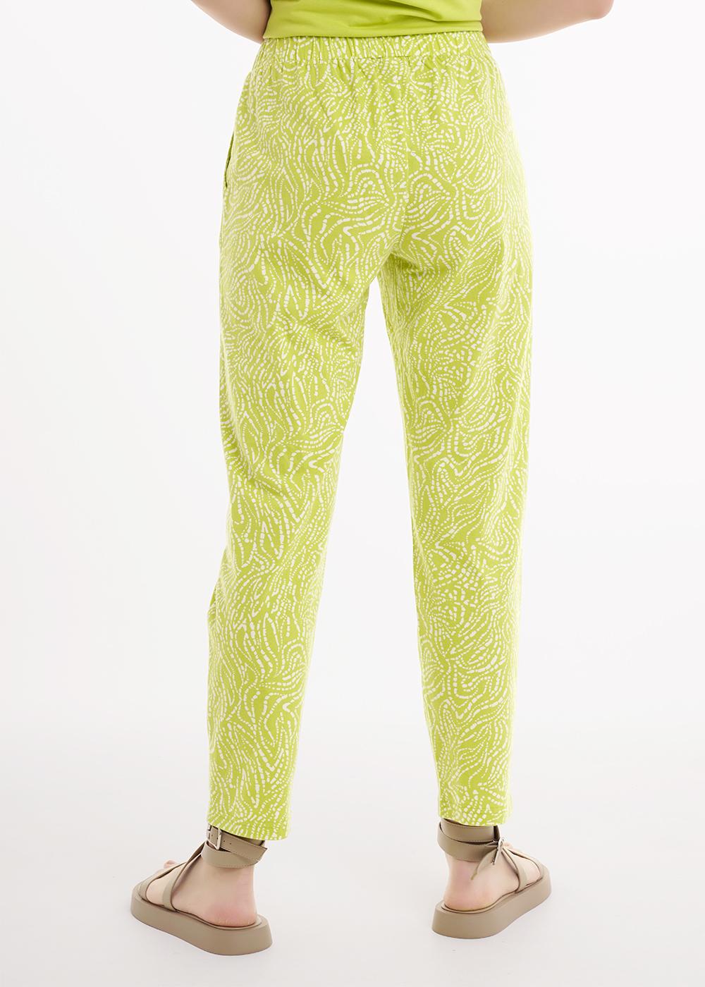 Женские домашние брюки прямого силуэта из набивного хлопкового полотна. Пояс на резинке, спереди выполнены карманы с отрезным бочком.