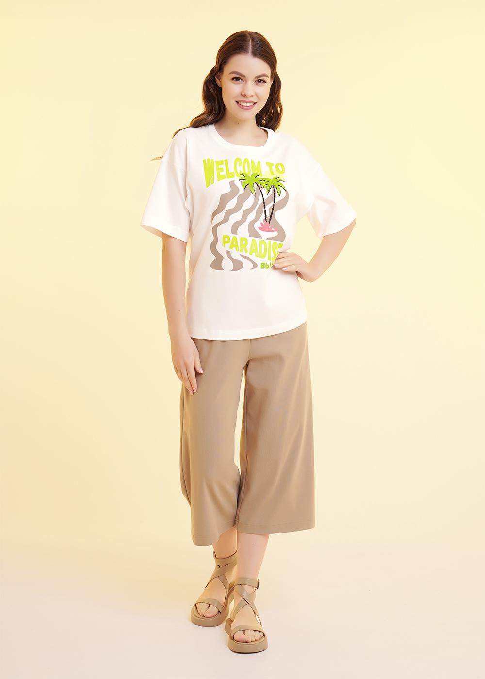 Брюки широкие для дома и отдыха из трикотажного полотна интерлок, с притачным поясом на резинке. Боковые карманы с отрезным бочком, принт вспенка.