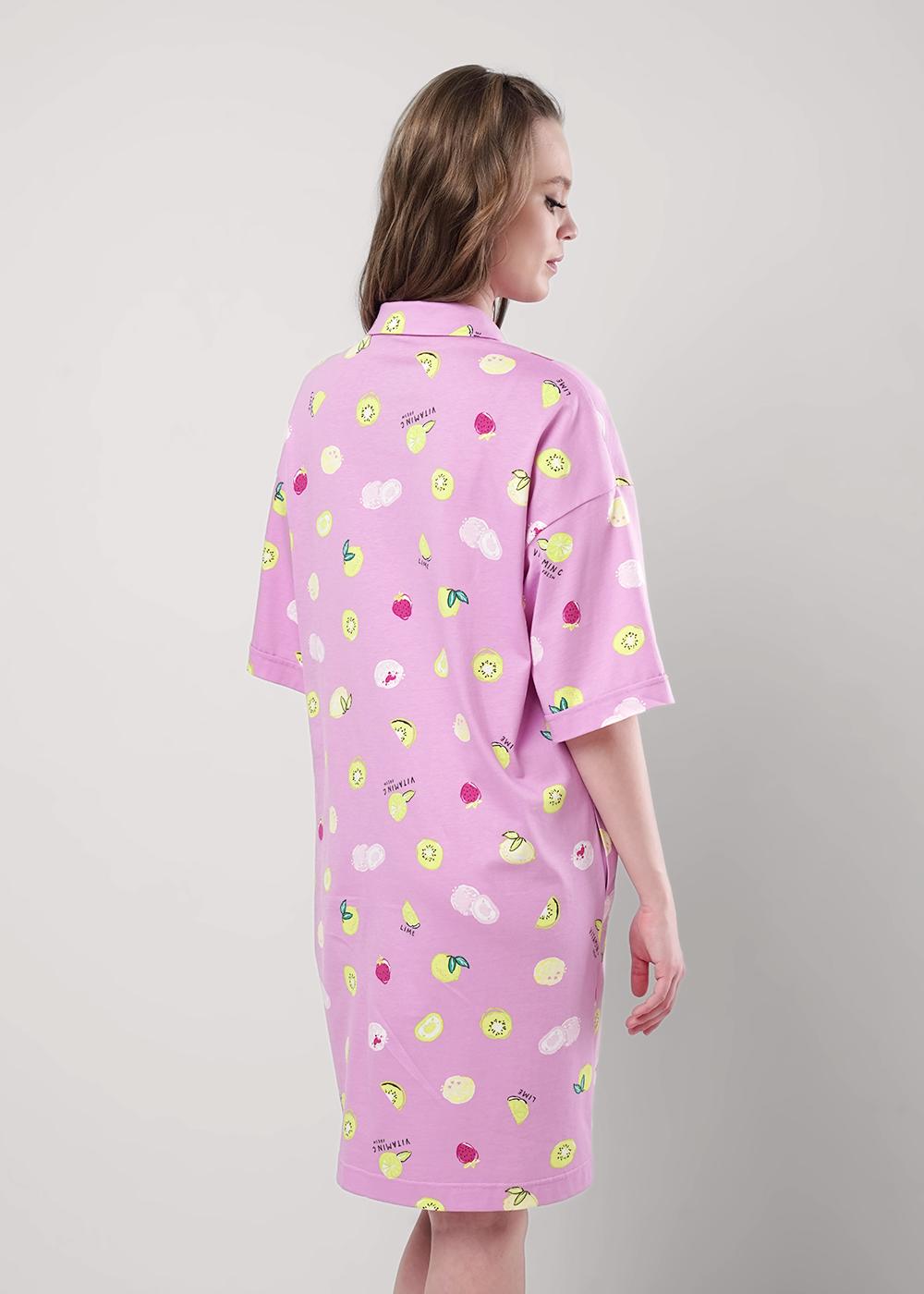Халат для дома свободного прямого кроя из хлопкового трикотажного полотна, с застежкой на пуговицы. Короткий рукав со спущенной линией плеча.По горловине отложной воротник,по борту цельновыкроенная планка.Спереди накладной карман, в боковых швах карманы.