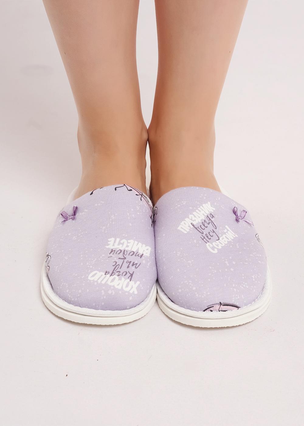 "Описание: Лёгкие, домашние тапочки с закрытым носом из хлопкового трикотажного полотна . В верхней части тапок нашивка бант. Толстая подошва.