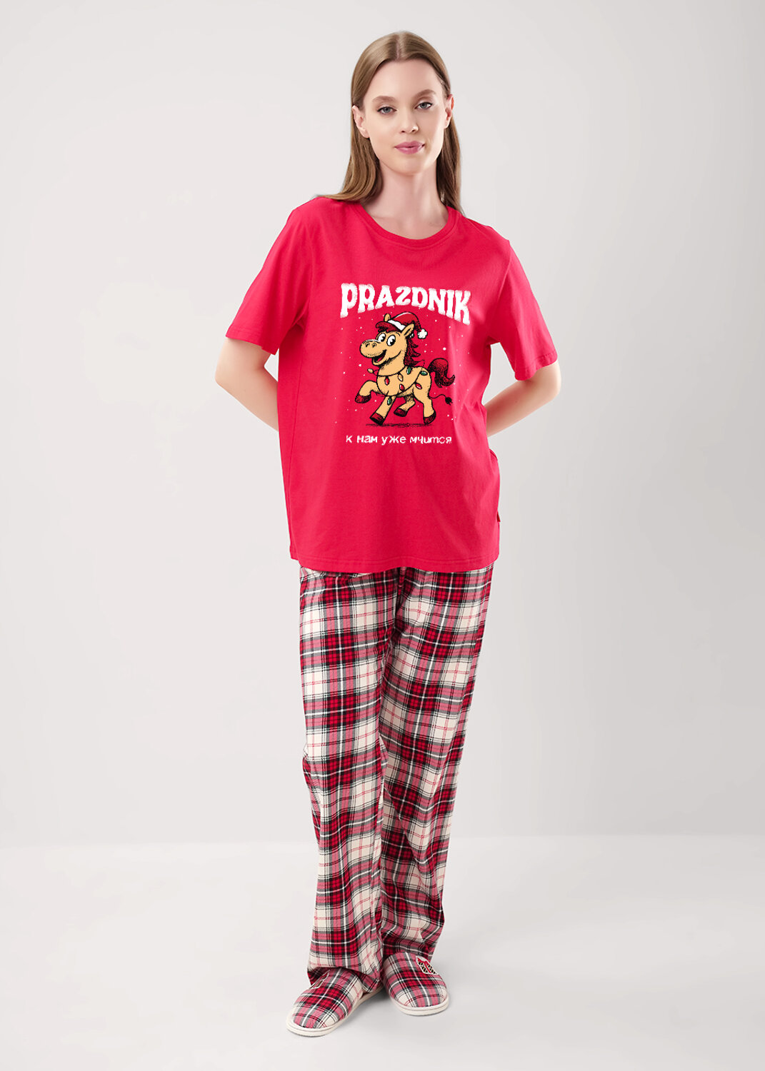 Пижама из хлопкового трикотажного полотна. Футболка прямого кроя. Короткий втачной рукав. Округлая горловина с обтачкой. Спереди принт. В боковом шве вшивка. Брюки из трикотажного полотна с карбоном прямые, пояс на внутренней резинке с киперной лентой.