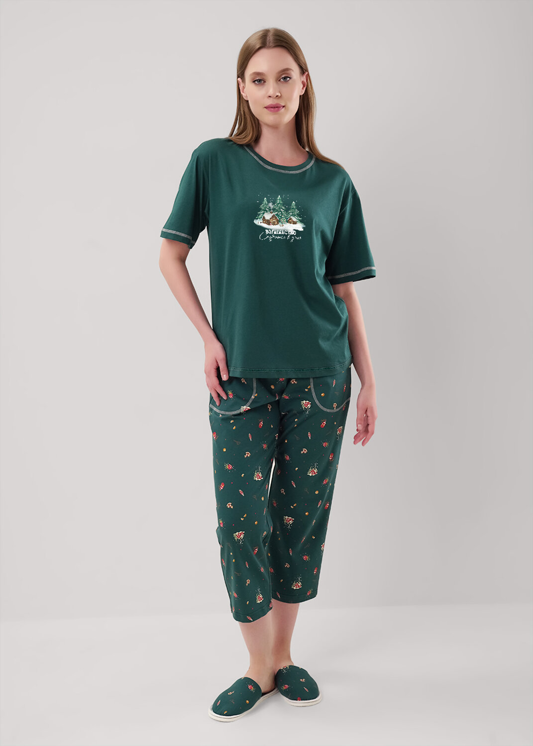 Пижама из трикотажного полотна. Футболка с коротким втачным рукавом, внизу застил. По горловине обтачка с застилом.Спереди принт, нашивка в боковом шве.Бриджи с поясом на внутренней резинке и киперной лентой. Боковые карманы с отрезным бочком,застил.