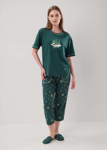 Платье для дома и отдыха прямого силуэта из хлопкового трикотажного полотна. Короткий втачной рукав. Округлая горловина с обтачкой. Боковые карманы. Обтачка горловины, низ рукава и карманы с застилом. Боковой разрез. Спереди принт.