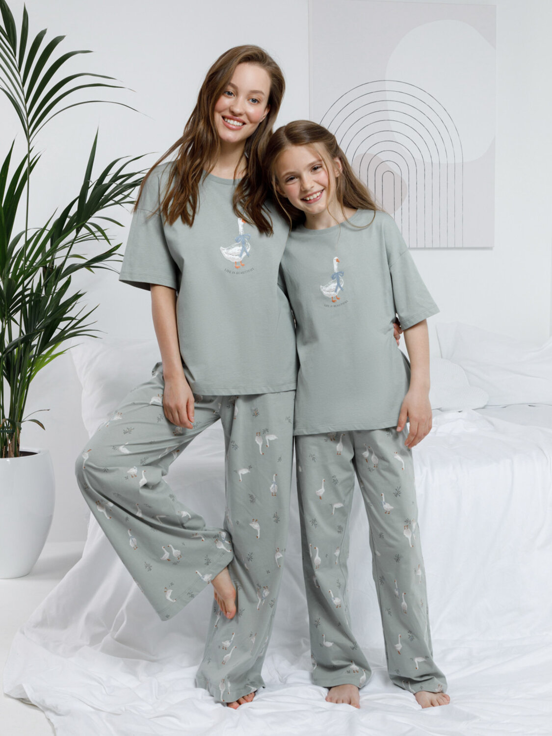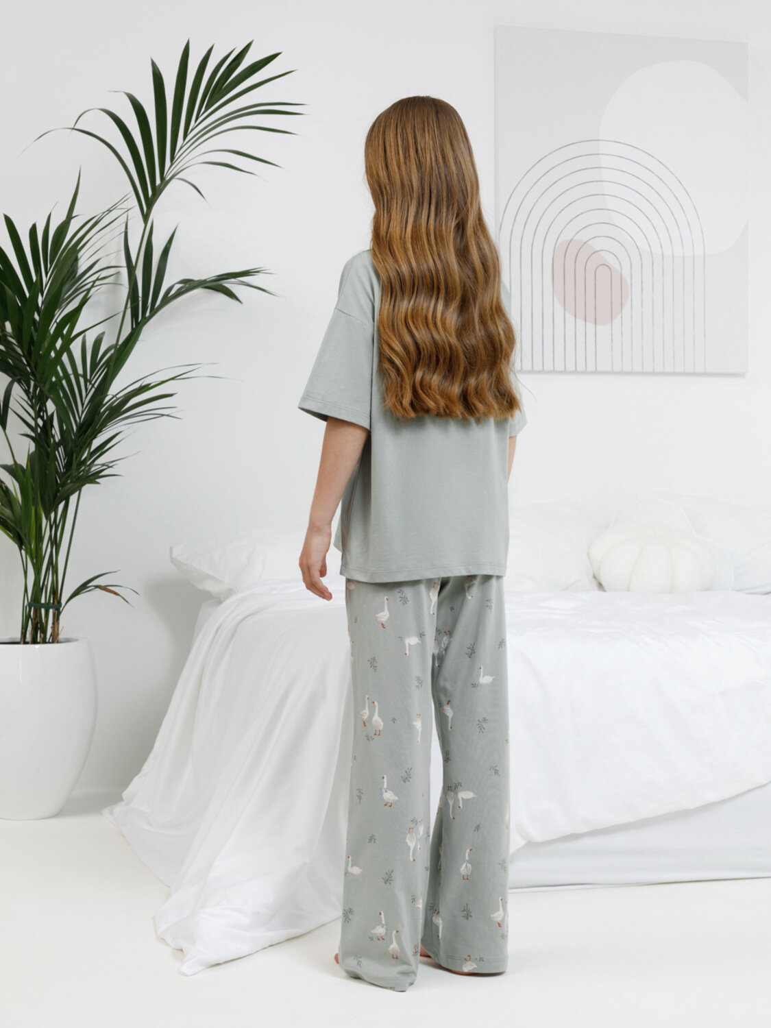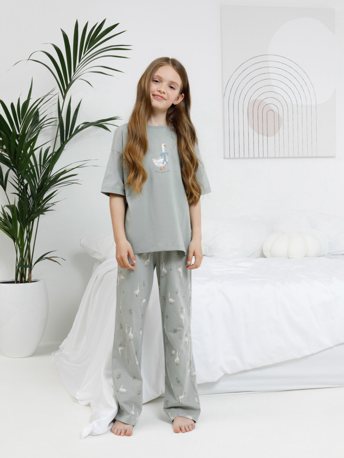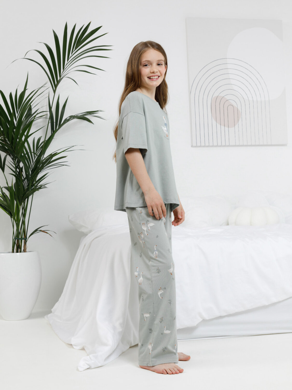 Трикотажная пижама из натурального хлопка для комфортного сна и отдыха. Футболка с короткими спущенными рукавами и прямые брюки с мягкой эластичной резинкой в поясе изготовлены из гладкого трикотажа супрем. Оригинальная набивка и принт выполнены из стойких текстильных гипоаллергенных красителей. Изделие сохраняет цвет и форму после многократных стирок. Все трикотажные полотна производятся в соответсвии с нормами швейцарского сертификата ЭкоТекс.