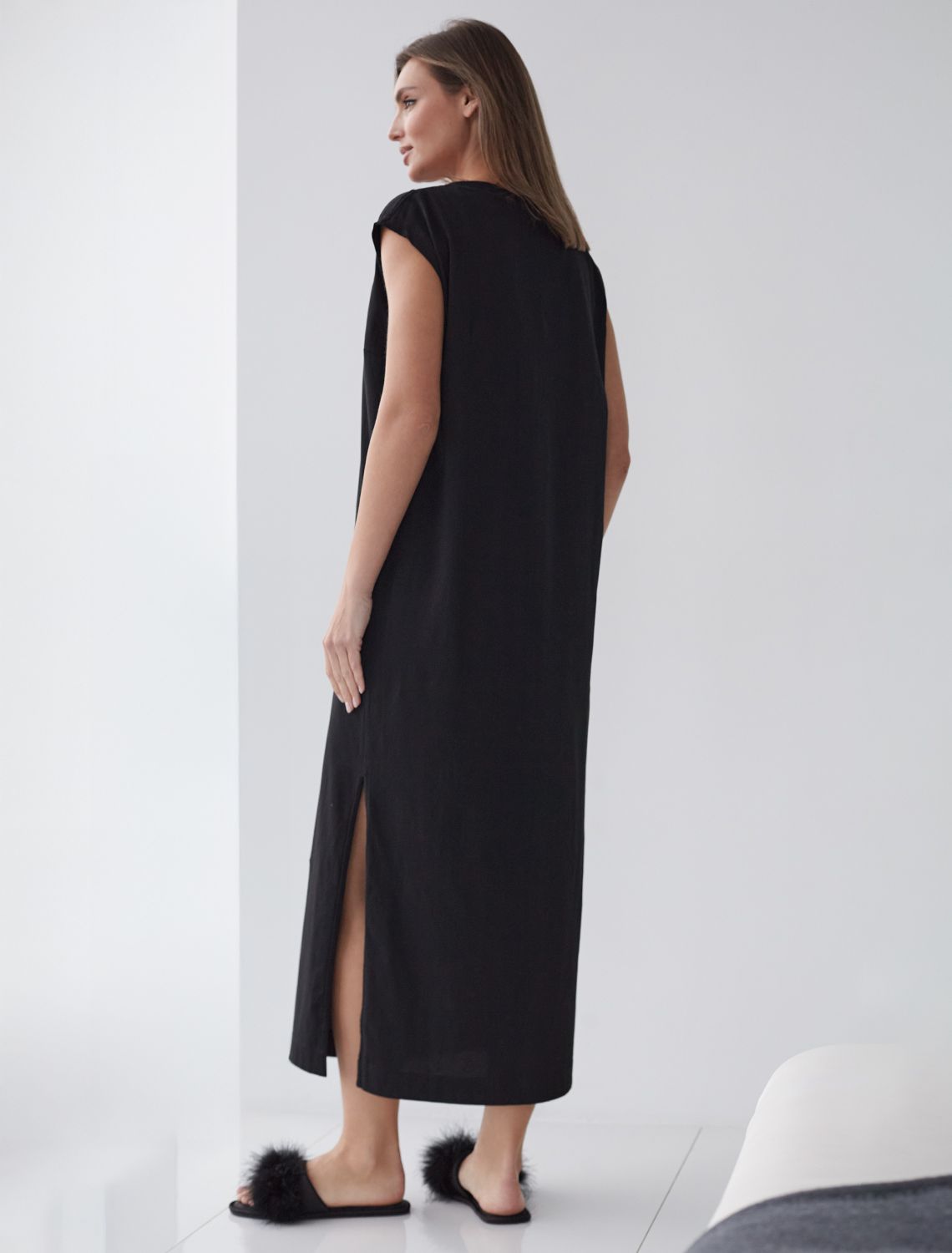 Стильное базовое платье черного цвета длины макси идеально для весны и лета. Легкое и дышащее, оно выполнено из натурального 100% хлопка, что обеспечивает комфортное ношение в теплое время года. Свободный и прямой крой не сковывает движений и легко скроет возможные недостатки фигуры. Благодаря разрезам платье добавляет легкости и непринужденности образу, делая его подходящим для повседневных и непринужденных мероприятий. Короткий цельнокроеный рукав и позволяет чувствовать себя удобно в теплую погоду, а так же в домашней обстановке. Простота кроя сочетается с современным дизайном, создавая гармоничный лук без излишеств. Это легкое платье подойдет для тех, кто ценит комфорт и элегантность одновременно.