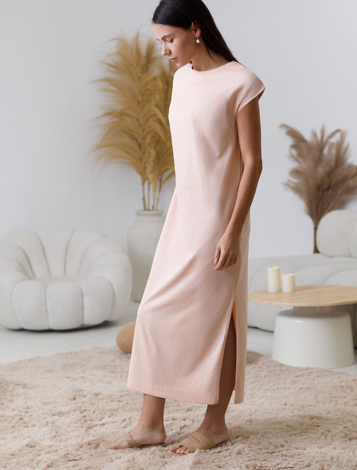 Стильное базовое платье пудрового цвета длины макси идеально для весны и лета. Легкое и дышащее, оно выполнено из натурального 100% хлопка, что обеспечивает комфортное ношение в теплое время года. Свободный и прямой крой не сковывает движений и легко скроет возможные недостатки фигуры. Благодаря разрезам платье добавляет легкости и непринужденности образу, делая его подходящим для повседневных и непринужденных мероприятий. Короткий цельнокроеный рукав и позволяет чувствовать себя удобно в теплую погоду, а так же в домашней обстановке. Простота кроя сочетается с современным дизайном, создавая гармоничный лук без излишеств. Это легкое платье подойдет для тех, кто ценит комфорт и элегантность одновременно. пудра