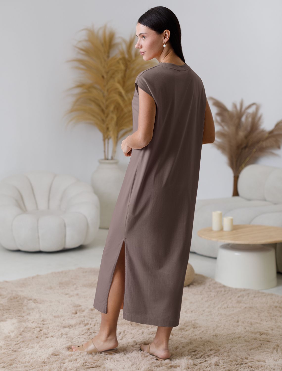 Стильное базовое платье кофейного цвета длины макси выполнено из 100% хлопка плотностью 140 Г/м2. Главная особенность этого изделия — тонкое кулирное полотно, которое легче и воздушнее стандартного трикотажа. Благодаря своей деликатной текстуре модель идеально подходит для домашних образов и пижамных комплектов. Ткань отлично «дышит», обеспечивая максимальный уют во время сна и отдыха. Свободный и прямой крой не сковывает движений и легко скроет возможные недостатки фигуры., а разрезы добавляют легкости и непринужденности образу. Короткий цельнокроеный рукав и позволяет чувствовать себя удобно в теплую погоду, а так же в домашней обстановке. Простота кроя сочетается с современным дизайном, создавая гармоничный лук без излишеств. Это легкое платье подойдет для тех, кто ценит комфорт и элегантность одновременно.