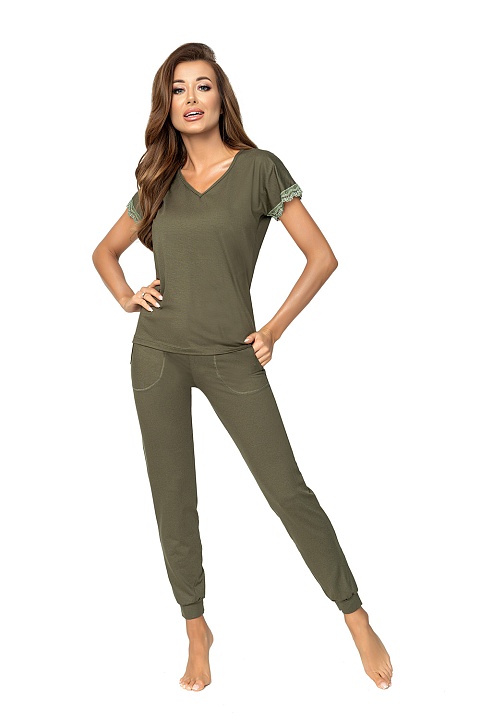Пижама Demi цвета хаки состоит из футболки и брюк. Футболка свободного кроя с V-образным вырезом горловины. Рукава декорированы ажурным кружевом. Брюки с манжетами по низу, по бокам удобные карманы. Комплект выполнен из мягкой гладкой вискозы и упакован в красивую плотную коробку.