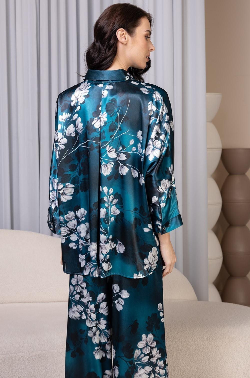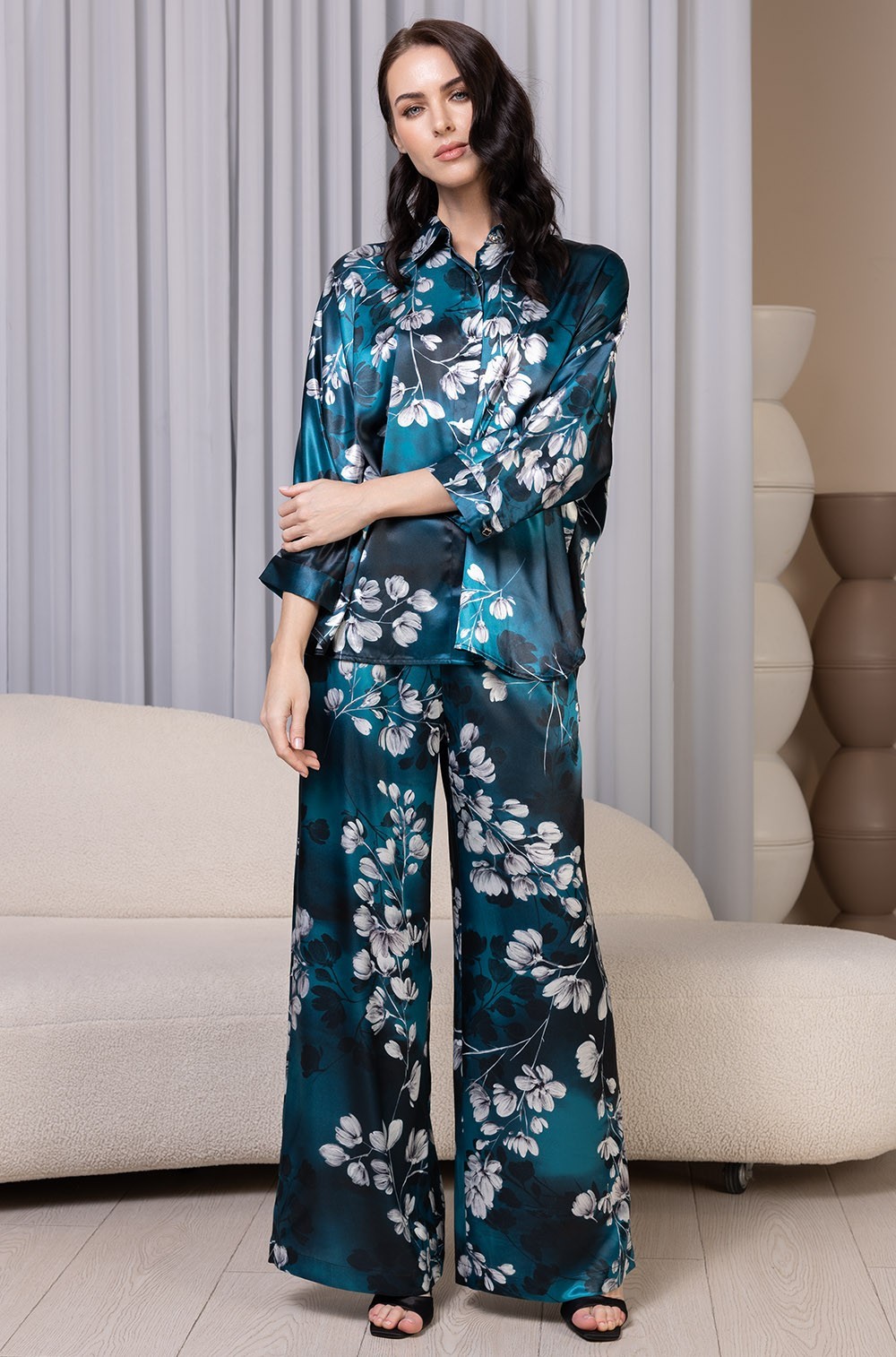 Комплект Mia-Amore состоит из рубашки и брюк, выполнен из смесового шёлка с цветочным фантазийным принтом. Рубашка свободного силуэта с застёжкой на пуговицы по центру, с рукавами длиной 7/8 с манжетами по низу. Брюки свободного силуэта с эластичным поясом и карманы в боковых швах.