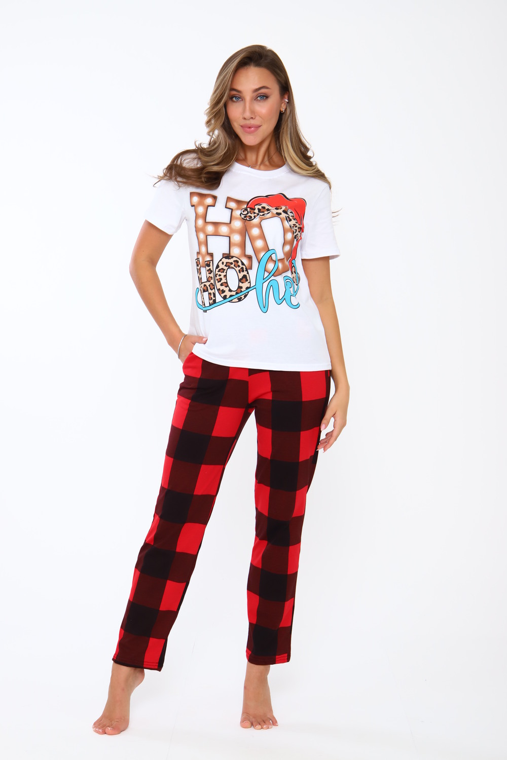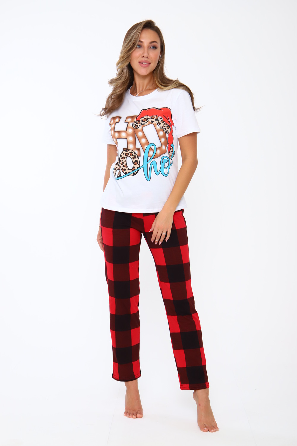 Новогодняя пижама из кулирки футболка красивым принтом, брюки набивка узор клетка красная и черная, брюки с карманами. Цвет: красный; Материал: кулирка;кулирка; Состав: 100% хлопок.