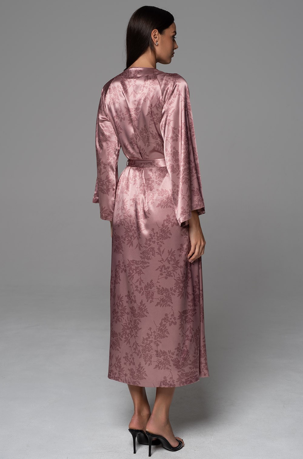 Длинный элегантный запашной халат Mia-Amore с широким длинным рукавом. Халат выполнен из принтованного смесового шелка. По бокам обработаны карманы.