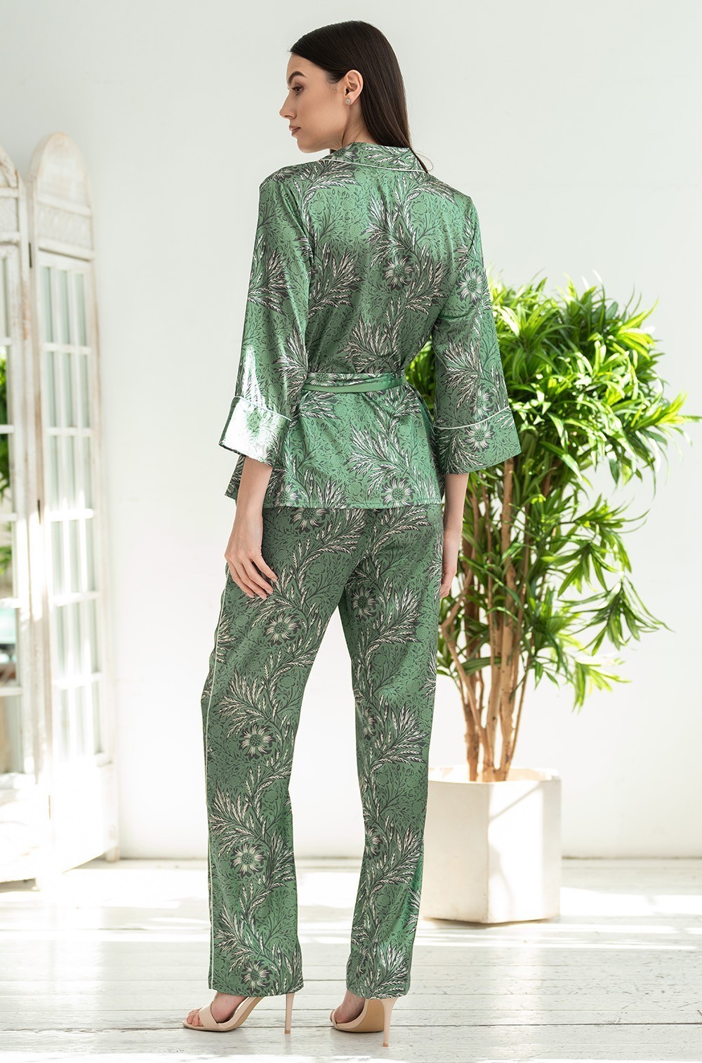 Брючный комплект Mia-Amore выполнен из искусственного принтованного шелка, состоит из жакета и брюк. Жакет на пуговицах, с рукавами длиной 7/8, на рукавах широкие притачные манжеты. Брюки длинные, с карманами в боковых швах, низ брюк с притачными широкими манжетами. Жакет и брюки декорированы отделкой в виде канта. Комплект дополнен поясом.