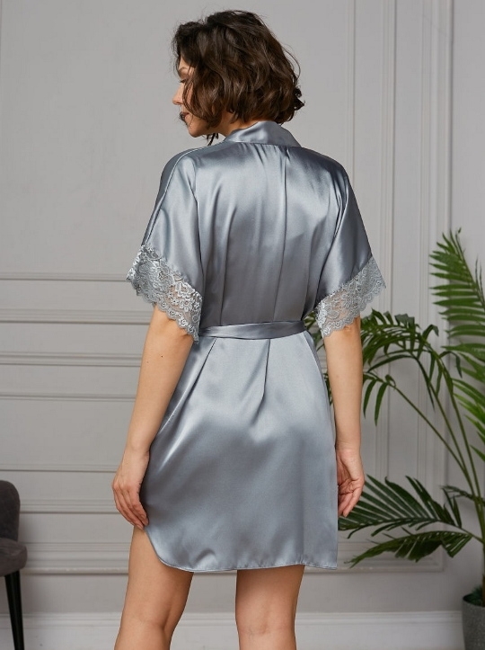 Бейлис 42/46 Короткий халат на запах из искусственного атласа с поясом, декорированный кружевом по рукаву. 100% полиэстер