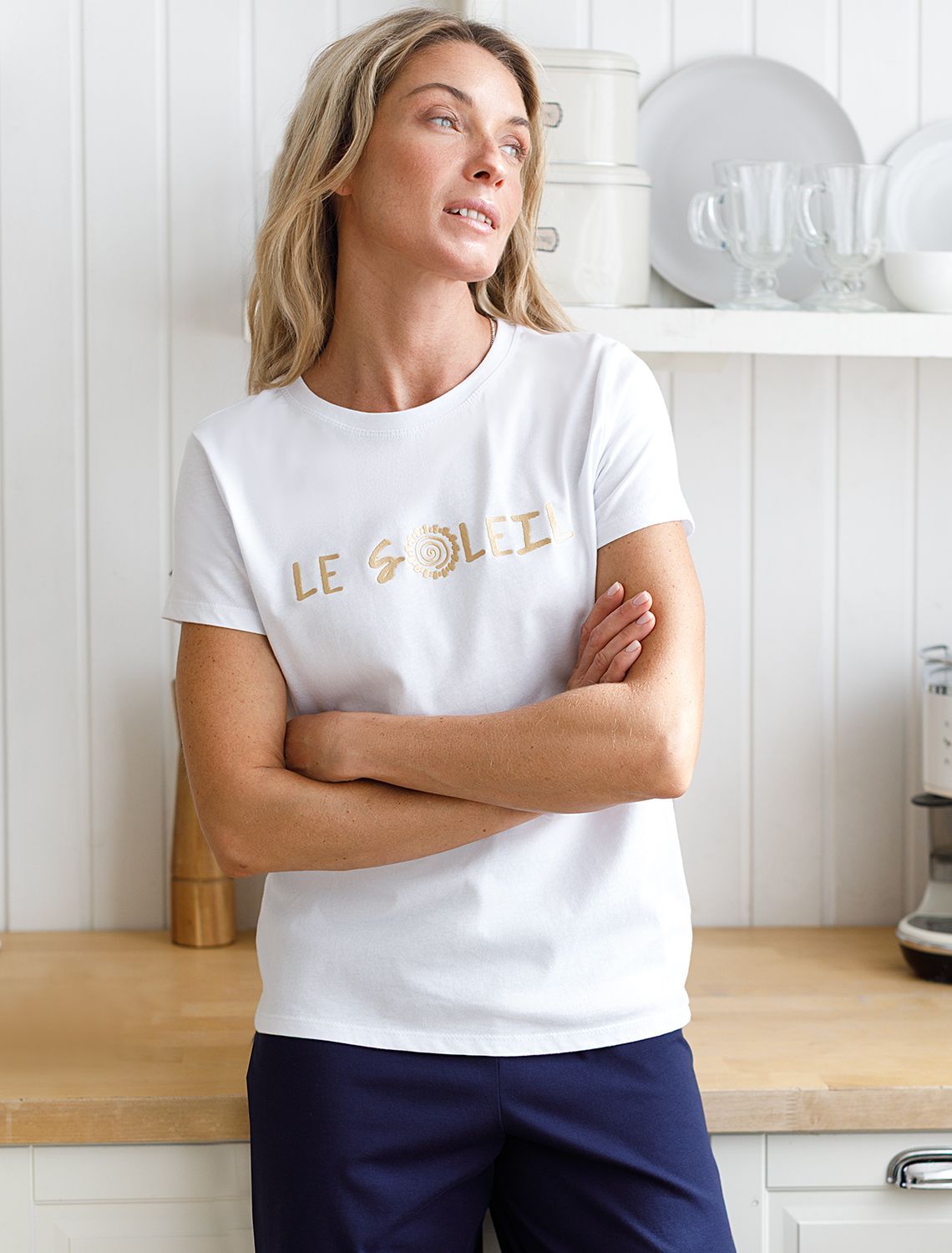 Перевод принта: "le soleil (фр.) - солнце". Футболка прямого кроя выполнена из 100% хлопка. Базовая модель дополнена лаконичным авторским принтом. Легко впишется в повседневный гардероб. Изделие хорошо держит форму и обеспечивает комфортный микроклимат в течение дня. белый_le_soleil