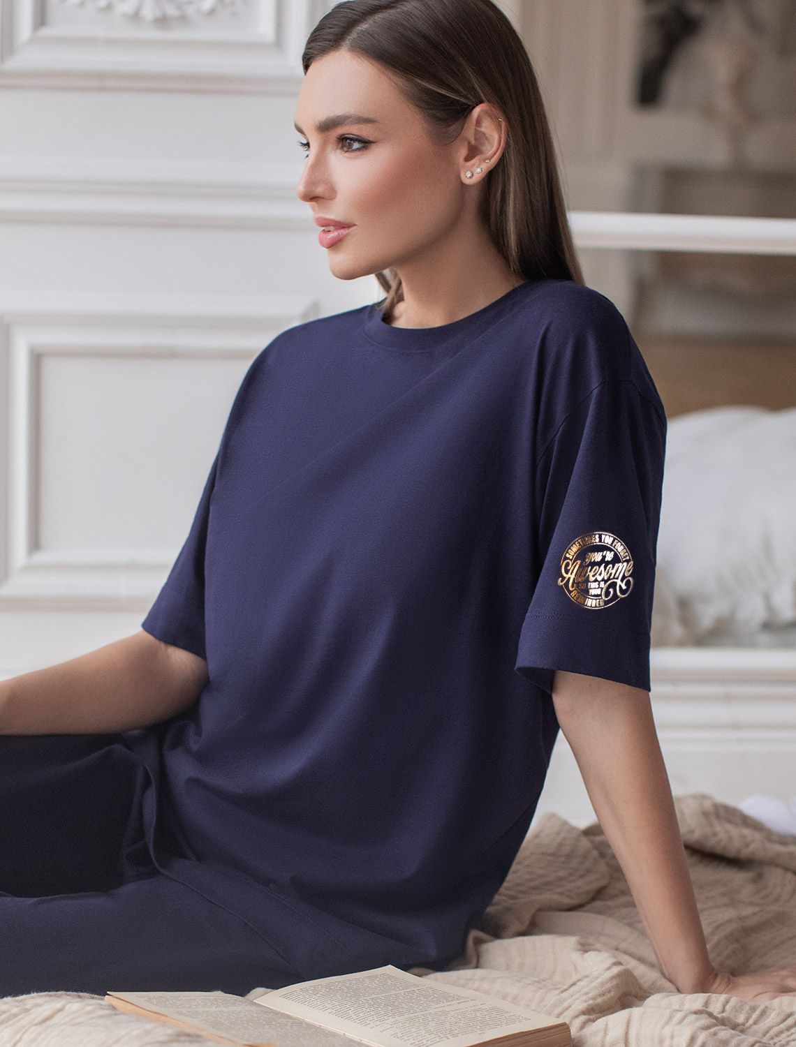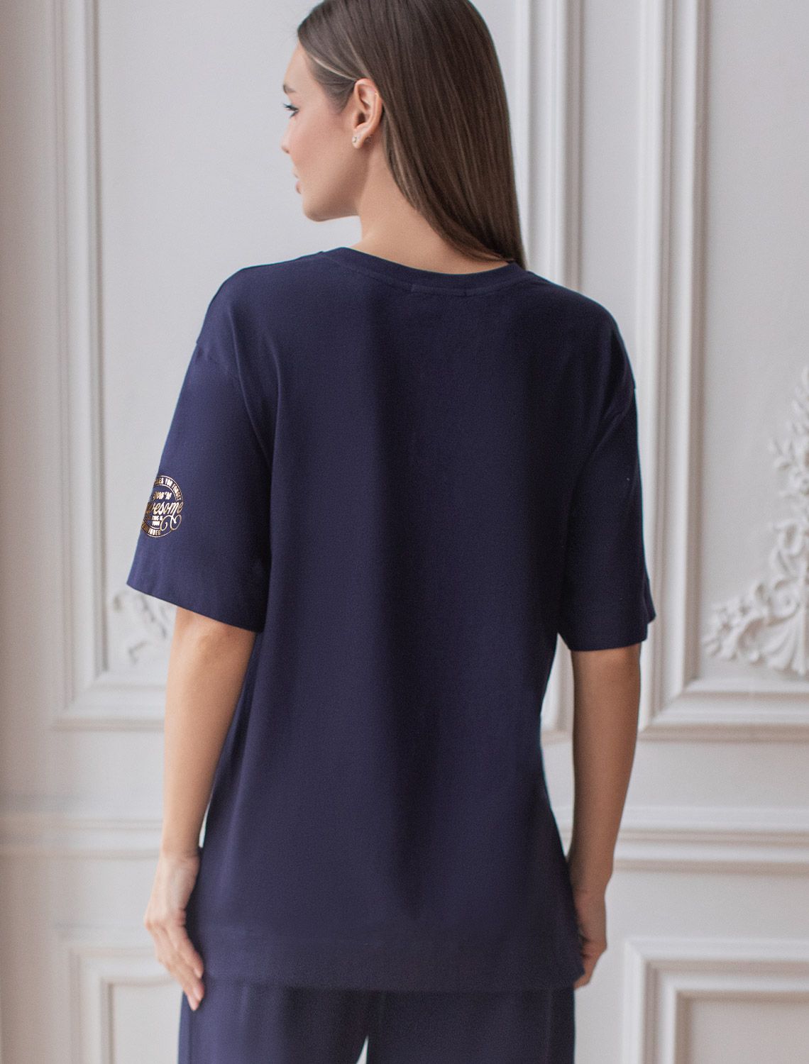 Оверсайз футболка темно-синего цвета изготовлена из премиального 100% хлопка, она обеспечивает невероятное ощущение уюта и легкости. Натуральный материал сохраняет форму и цвет после множества стирок, обеспечивая долговечность изделия, а его высокая воздухопроницаемость создает ощущение свежести даже в течение долгого дня. Особое внимание привлекает стильный принт в виде надписи на рукаве. Перевод надписи: Sometimes you forget Reminder You re Awesome So tnis is your - Иногда ты забываешь, как ты крута, так что это твое напоминание. Принт выполнен красками с устойчивым покрытием, который добавляет футболке оригинальности и позволяет выразить индивидуальность. Свободный крой футболки дарит удобство и не стесняет движений, что делает ее идеальной для повседневной носки или активного отдыха, подчеркивает современный взгляд на моду. Подойдет девушкам и женщинам на любую фигуру, вы будете чувствовать себя в ней уверенно и комфортно. Отлично впишется в гардероб благодаря универсальному дизайну, который легко сочетать с любыми низами.