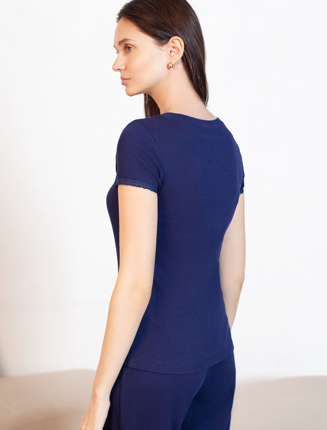 Футболка темно-синего цвета с круглым вырезом из фактурного трикотажа в рубчик идеально сочетается с повседневным стилем и подходит для домашней носки или отдыха. Мягкое полотно из хлопка обеспечивает максимальный комфорт даже в течение длительного времени. Особенность этого изделия — эластичная структура ткани, благодаря чему она хорошо тянется и подстраивается под особенности фигуры. Короткие рукава делают модель легкой и универсальной. На рукавах отделка нежным кружевом в тон основного цвета добавляет нотку романтичности. Футболка подойдет для девушек и женщин, которые ценят уют и удобство. Нежная ткань приятна к телу, не вызывает дискомфорта и позволяет коже дышать, что особенно важно в повседневной жизни. Футболка в мелкий рубчик полуприлегающего кроя визуально вытягивает силуэт и делает фигуру более стройной. Разнообразие размеров позволяет выбрать подходящий вариант для любых параметров, в том числе на большие размеры. Эта красивая футболка практична и незаменима для тех, кто ищет качественные и стильные вещи на каждый день.