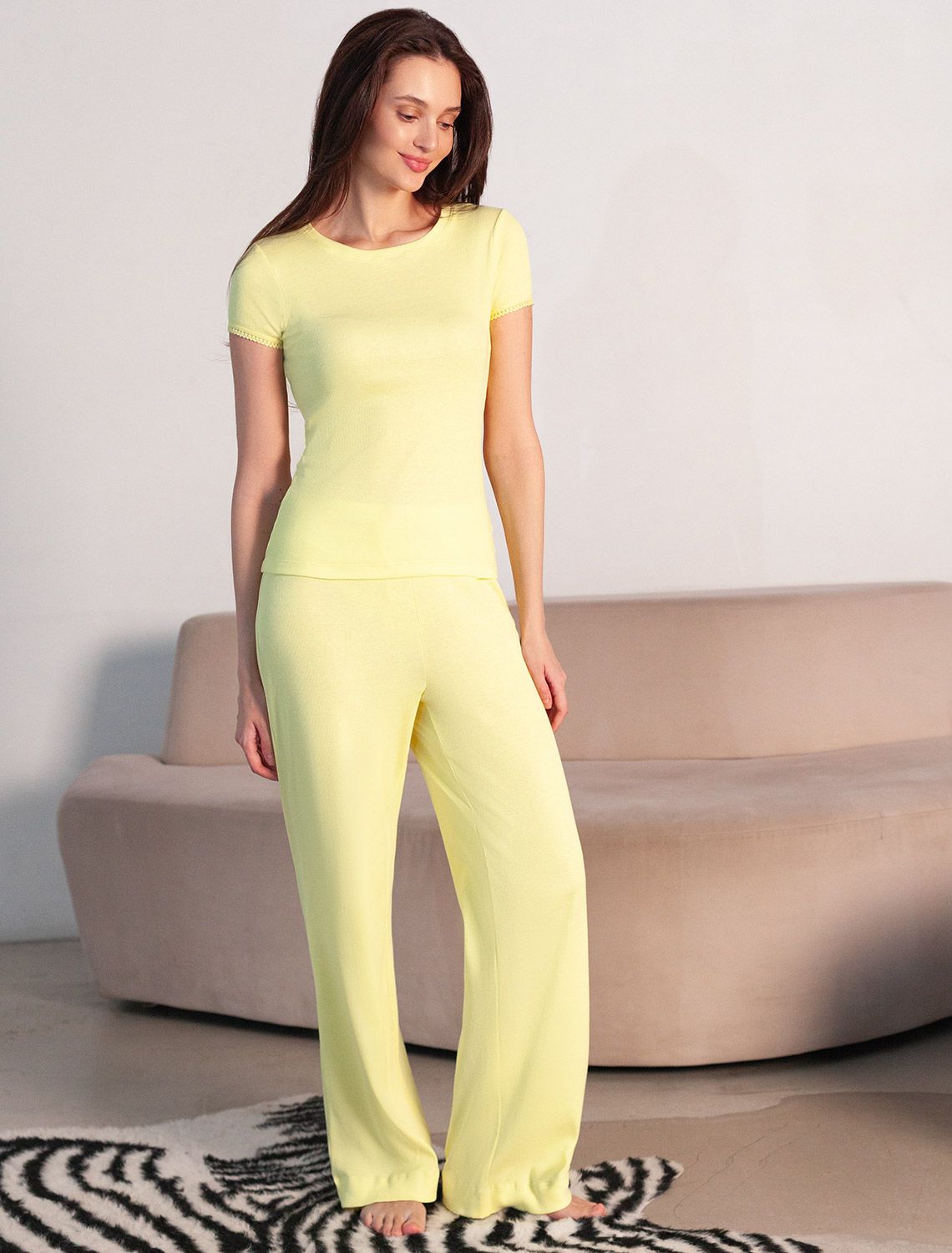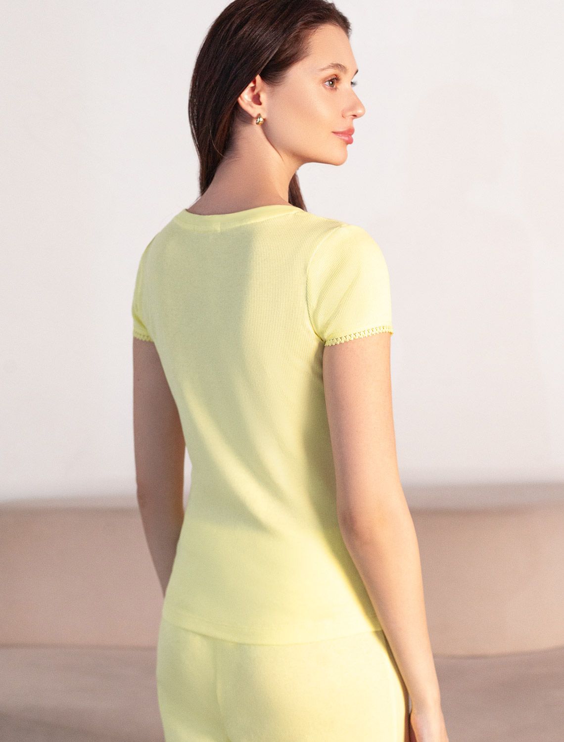Футболка лимонного цвета с круглым вырезом из из фактурного трикотажа в рубчик идеально сочетается с повседневным стилем и подходит для домашней носки или отдыха. Мягкое полотно из хлопка обеспечивает максимальный комфорт даже в течение длительного времени. Особенность этого изделия — эластичная структура ткани, благодаря чему она хорошо тянется и подстраивается под особенности фигуры. Короткие рукава делают модель легкой и универсальной. На рукавах отделка нежным кружевом в тон основного цвета добавляет нотку романтичности. Футболка подойдет для девушек и женщин, которые ценят уют и удобство. Нежная ткань приятна к телу, не вызывает дискомфорта и позволяет коже дышать, что особенно важно в повседневной жизни. Футболка в мелкий рубчик полуприлегающего кроя визуально вытягивает силуэт и делает фигуру более стройной. Разнообразие размеров позволяет выбрать подходящий вариант для любых параметров, в том числе на большие размеры. Эта красивая футболка практична и незаменима для тех, кто ищет качественные и стильные вещи на каждый день.