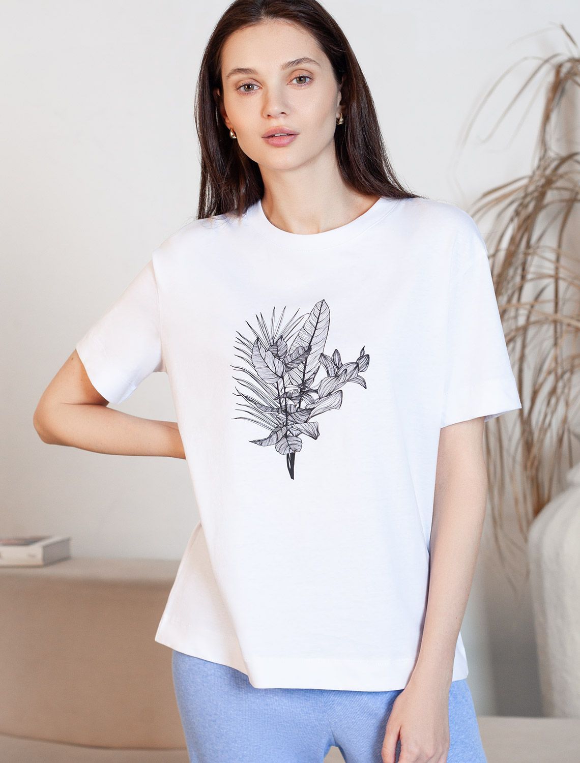 Футболка белого цвета изготовлена из премиального 100% хлопка, благодаря чему изделие приятно прилегает к телу, не вызывает дискомфорта и идеально подходит для чувствительной кожи. Натуральный материал сохраняет форму и цвет после множества стирок, обеспечивая долговечность изделия, а его высокая воздухопроницаемость создает ощущение свежести даже в течение долгого дня. Особое внимание привлекает стильный принт контрастного цвета в виде тропических растений. Принт выполнен красками с устойчивым покрытием, который добавляет изделию оригинальности и позволяет выразить индивидуальность. Свободный крой футболки дарит удобство и не стесняет движений, что делает ее идеальной для повседневной носки или активного отдыха, подчеркивает современный взгляд на моду. Подойдет девушкам и женщинам на любую фигуру, вы будете чувствовать себя в ней уверенно и комфортно. Лаконичный современный принт делает изделие универсальным: можно создавать стильные образы для прогулок, встреч, занятий спортом и домашних дел. Базовая футболка подходит для любой ситуации и сочетается с разными элементами гардероба.