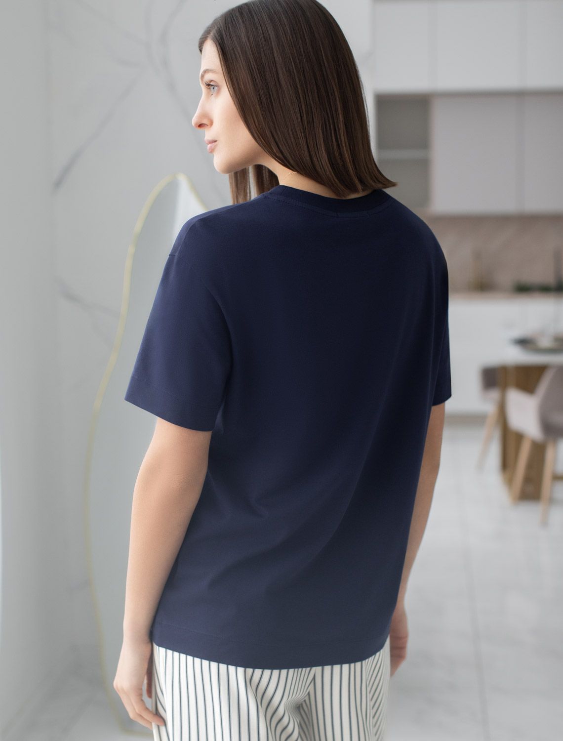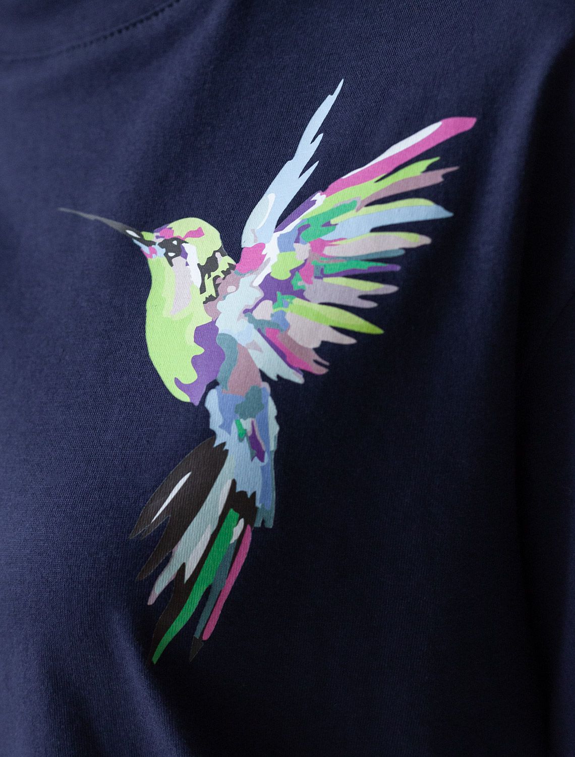Футболка темно-синего цвета изготовлена из премиального 100% хлопка, благодаря чему изделие приятно прилегает к телу, не вызывает дискомфорта и идеально подходит для чувствительной кожи. Натуральный материал сохраняет форму и цвет после множества стирок, обеспечивая долговечность изделия, а его высокая воздухопроницаемость создает ощущение свежести даже в течение долгого дня. Особое внимание привлекает стильный принт контрастного цвета в виде колибри. Принт выполнен красками с устойчивым покрытием, который добавляет изделию оригинальности и позволяет выразить индивидуальность. Свободный крой футболки дарит удобство и не стесняет движений, что делает ее идеальной для повседневной носки или активного отдыха, подчеркивает современный взгляд на моду. Подойдет девушкам и женщинам на любую фигуру, вы будете чувствовать себя в ней уверенно и комфортно. Лаконичный современный принт делает изделие универсальным: можно создавать стильные образы для прогулок, встреч, занятий спортом и домашних дел. Базовая футболка подходит для любой ситуации и сочетается с разными элементами гардероба.
