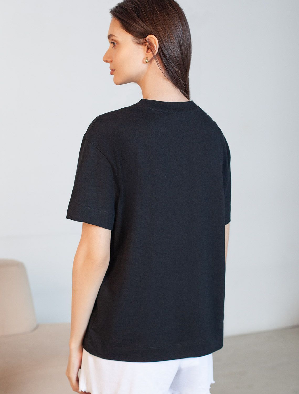 Футболка черного цвета изготовлена из премиального 100% хлопка, благодаря чему изделие приятно прилегает к телу, не вызывает дискомфорта и идеально подходит для чувствительной кожи. Натуральный материал сохраняет форму и цвет после множества стирок, обеспечивая долговечность изделия, а его высокая воздухопроницаемость создает ощущение свежести даже в течение долгого дня. Особое внимание привлекает стильный принт контрастного цвета в виде сердца с надписью. Принт выполнен красками с устойчивым покрытием, который добавляет изделию оригинальности и позволяет выразить индивидуальность. Перевод надписи: Улыбайся, будь позитивной. Верь в себя, люби. Свободный крой футболки дарит удобство и не стесняет движений, что делает ее идеальной для повседневной носки или активного отдыха, подчеркивает современный взгляд на моду. Подойдет девушкам и женщинам на любую фигуру, вы будете чувствовать себя в ней уверенно и комфортно. Лаконичный современный принт делает изделие универсальным: можно создавать стильные образы для прогулок, встреч, занятий спортом и домашних дел. Базовая футболка подходит для любой ситуации и сочетается с разными элементами гардероба.