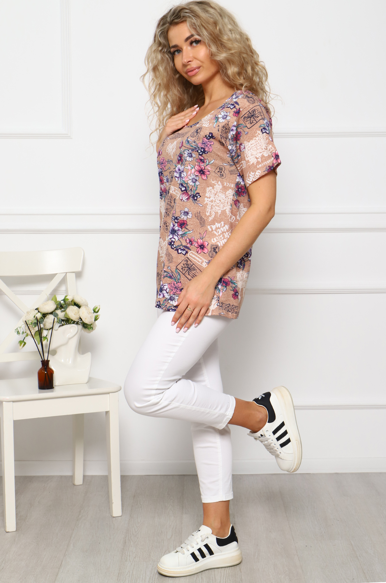 Женская хлопковая футболка. Модель прямого кроя, рукав втачной. Ткань кулирка с набивным рисунком.