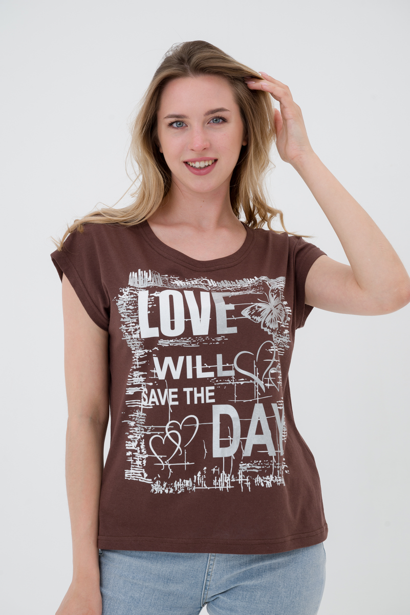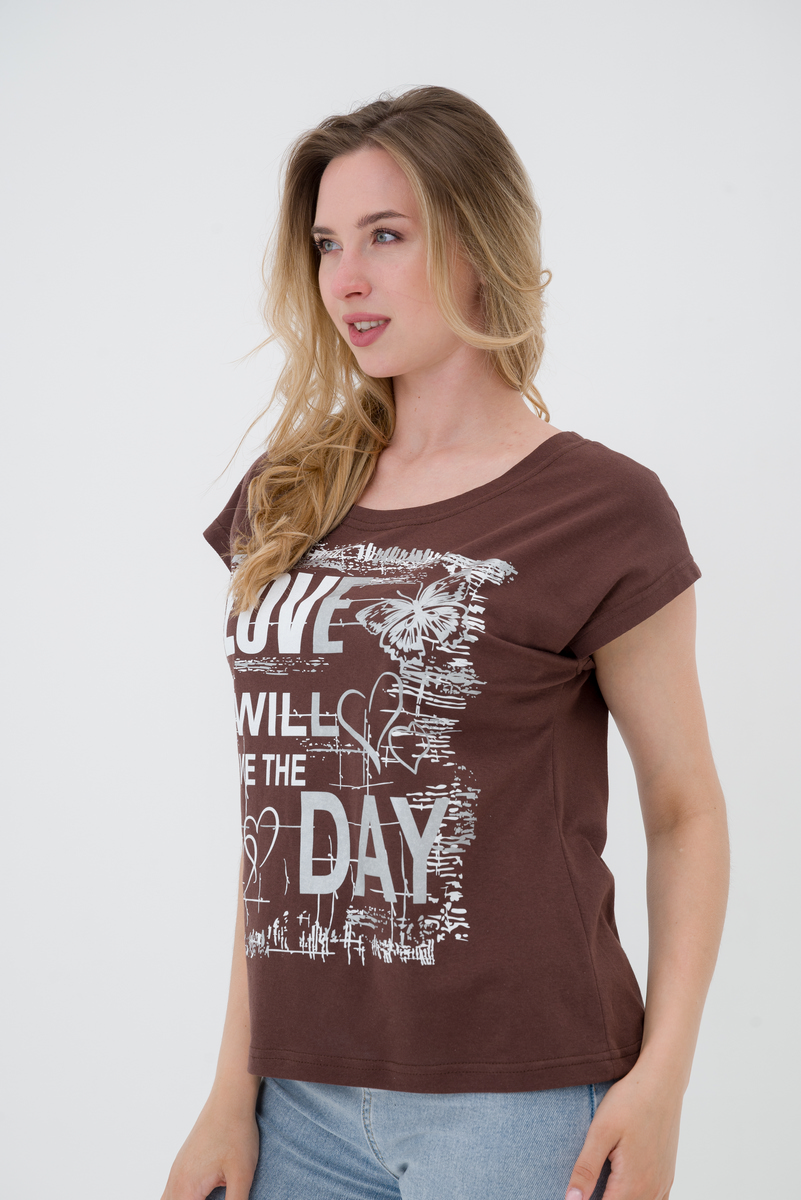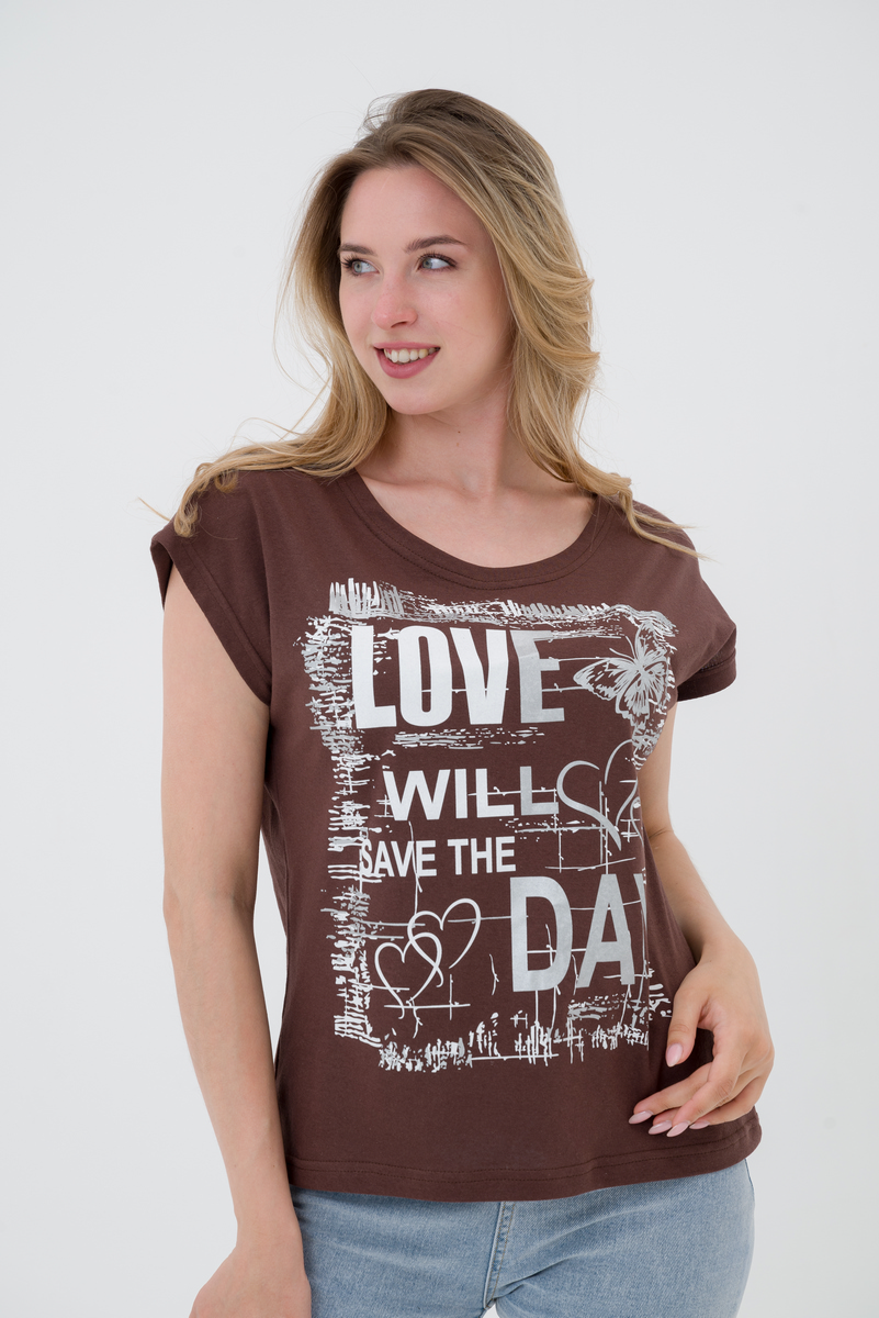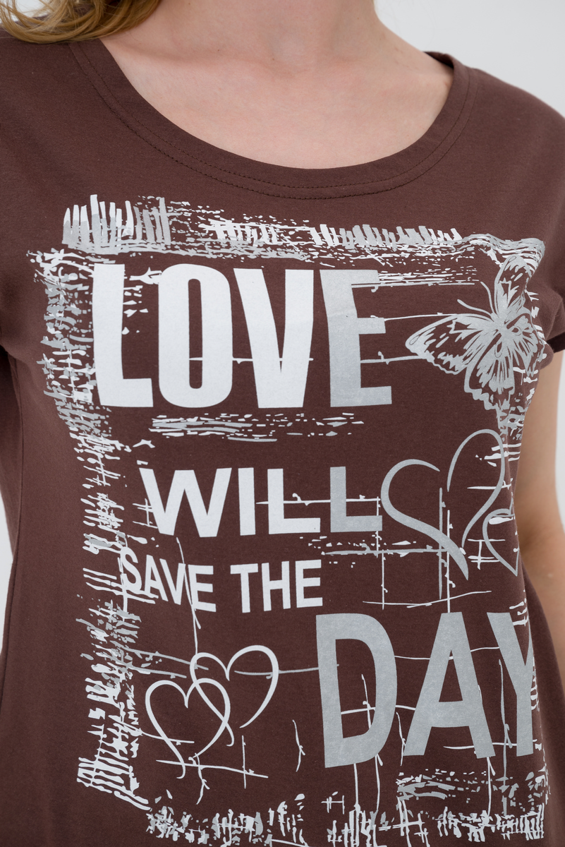 Футболка женская со спущенным плечом из кулирки Лира шоколад с принтом Love