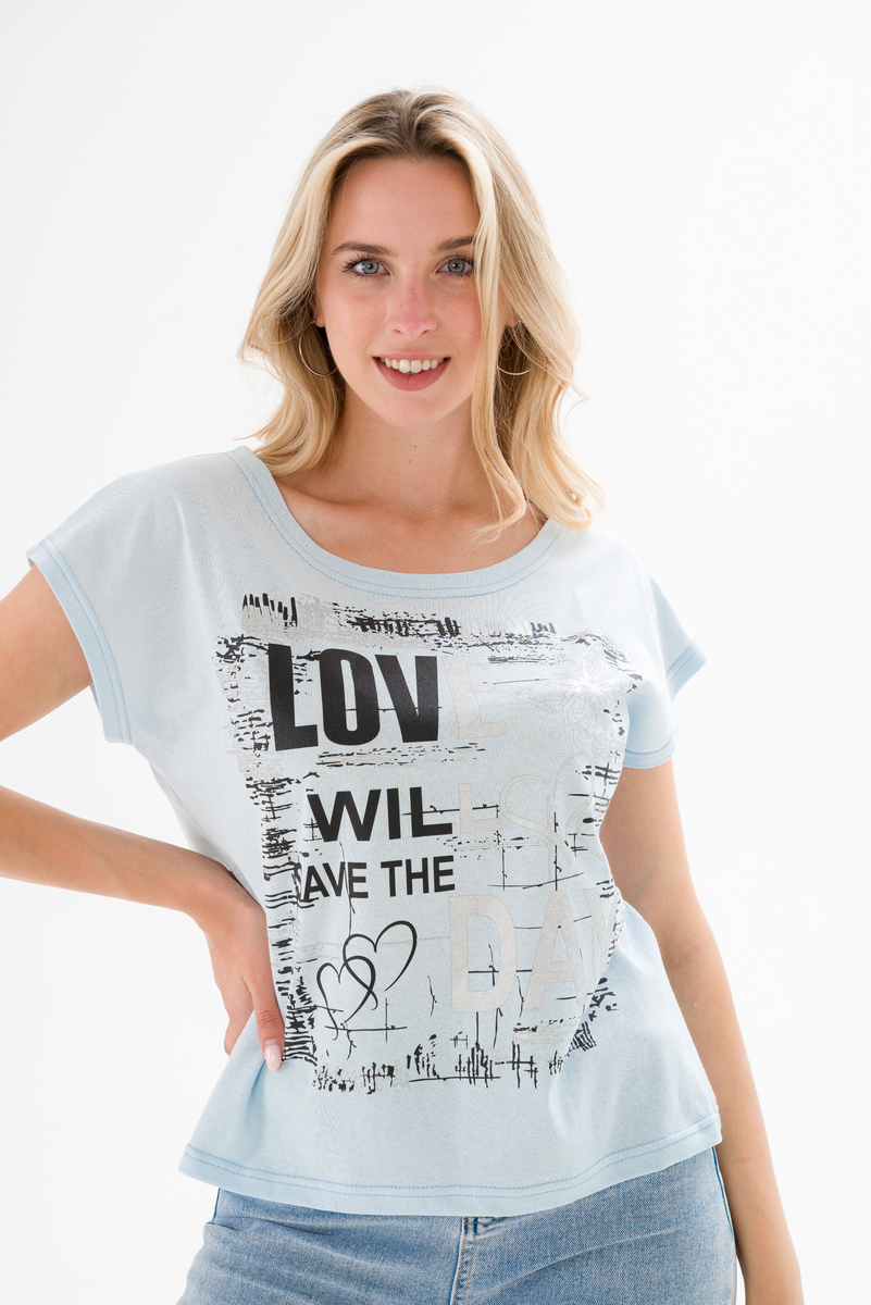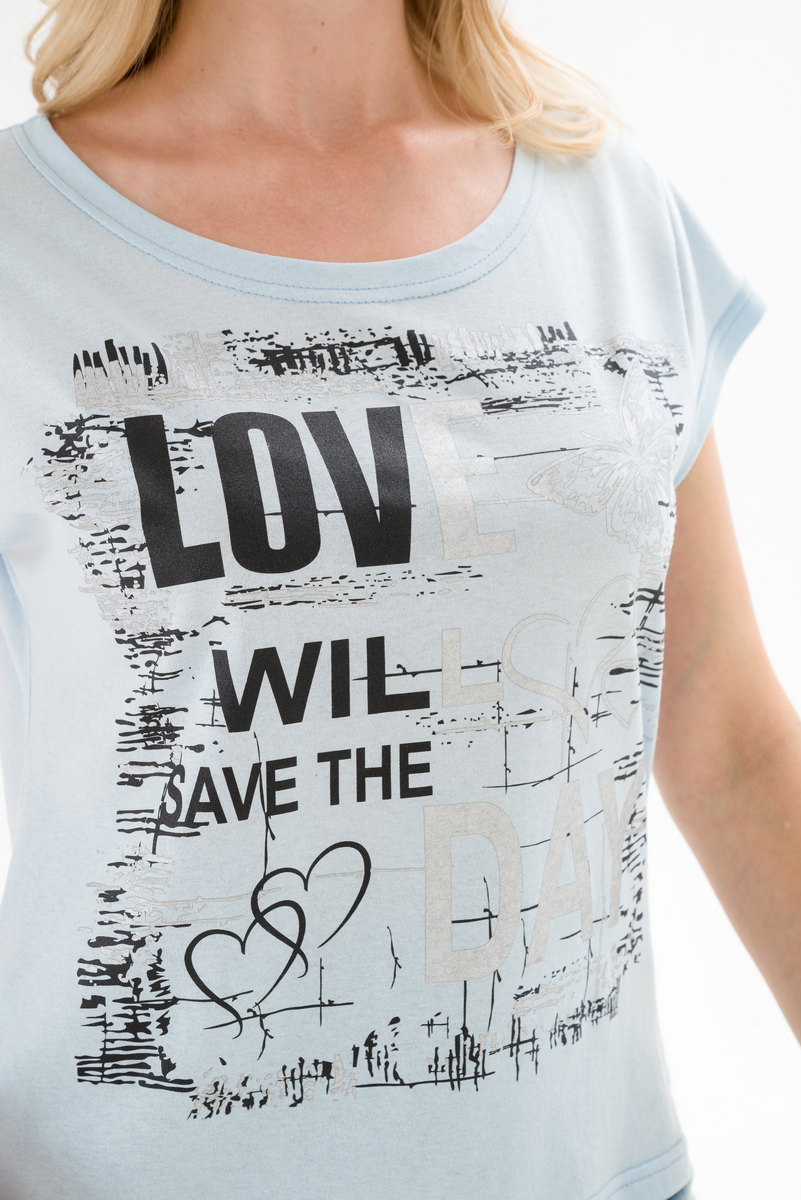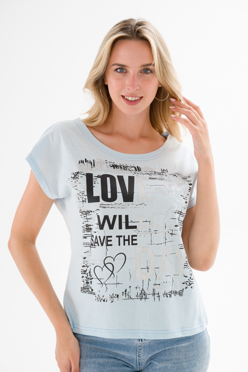 Футболка женская со спущенным плечом из кулирки Лира светло-голубой с принтом Love
