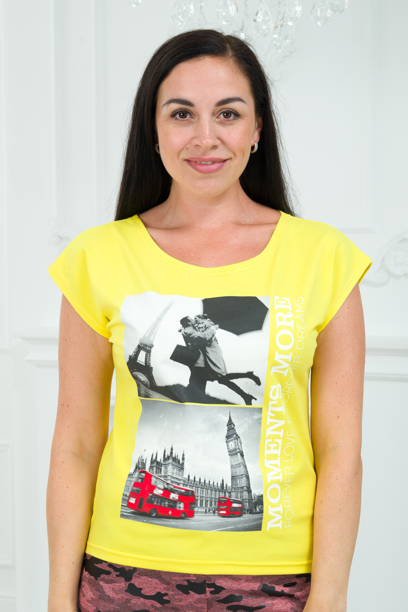 Футболка женская со спущенным плечом из кулирки Лира жёлтый с принтом Moments