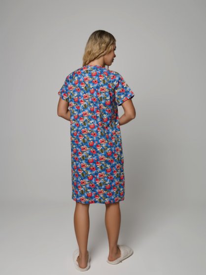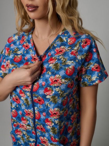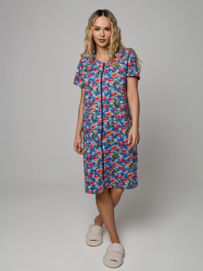 Оптовая продажа. Халат женский из трикотажного полотна кулирная гладь, прямой, среднего объема, длиной до колена, с легким расширением книзу, с короткими рукавами типа реглан, центральной застежкой на молнию. Горловина и срезы борта окантованы узкой бейкой из основного полотна. На полочке настрочены накладные карманы "кенгуру". Удобный свободный крой дарит комфорт и ощущение свободы движений. Одежда из хлопка комфортна и приятна для кожи, дышащая и легкая, длительное время не разрушается под влиянием воды. Рекомендуется бережная стирка при 30С.
