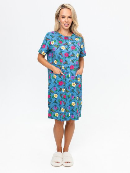 Оптовая продажа. Халат женский из трикотажного полотна кулирная гладь, прямой, среднего объема, длиной до колена, с короткими втачными рукавами, округлым вырезом горловины, центральной застежкой на пуговки, боковыми карманами.