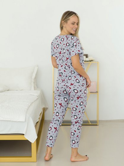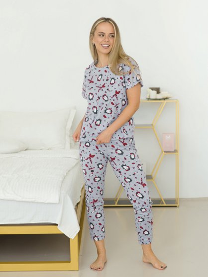 Оптовая продажа. Пижама женская из хлопка с рисунком "Пингвины" по всему полотну. Футболка прямая, полуприлегающего силуэта, с короткими рукавами, округлым вырезом горловины. Брюки прямые, прилегающего силуэта, 7/8 длины, пояс на резинке.