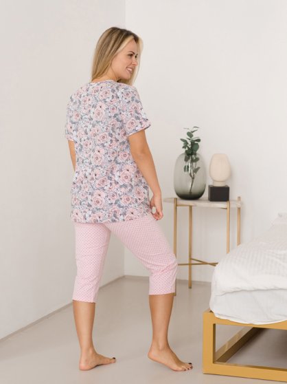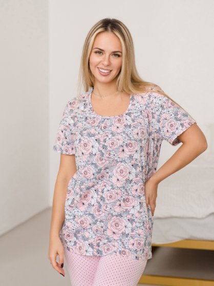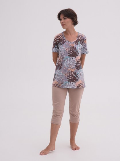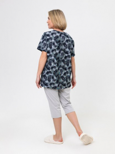 Оптовая продажа. Пижама женская: Футболка свободного силуэта, небольшая сборка по линии горловины, орнаментальный принт. Лосины однотонные.