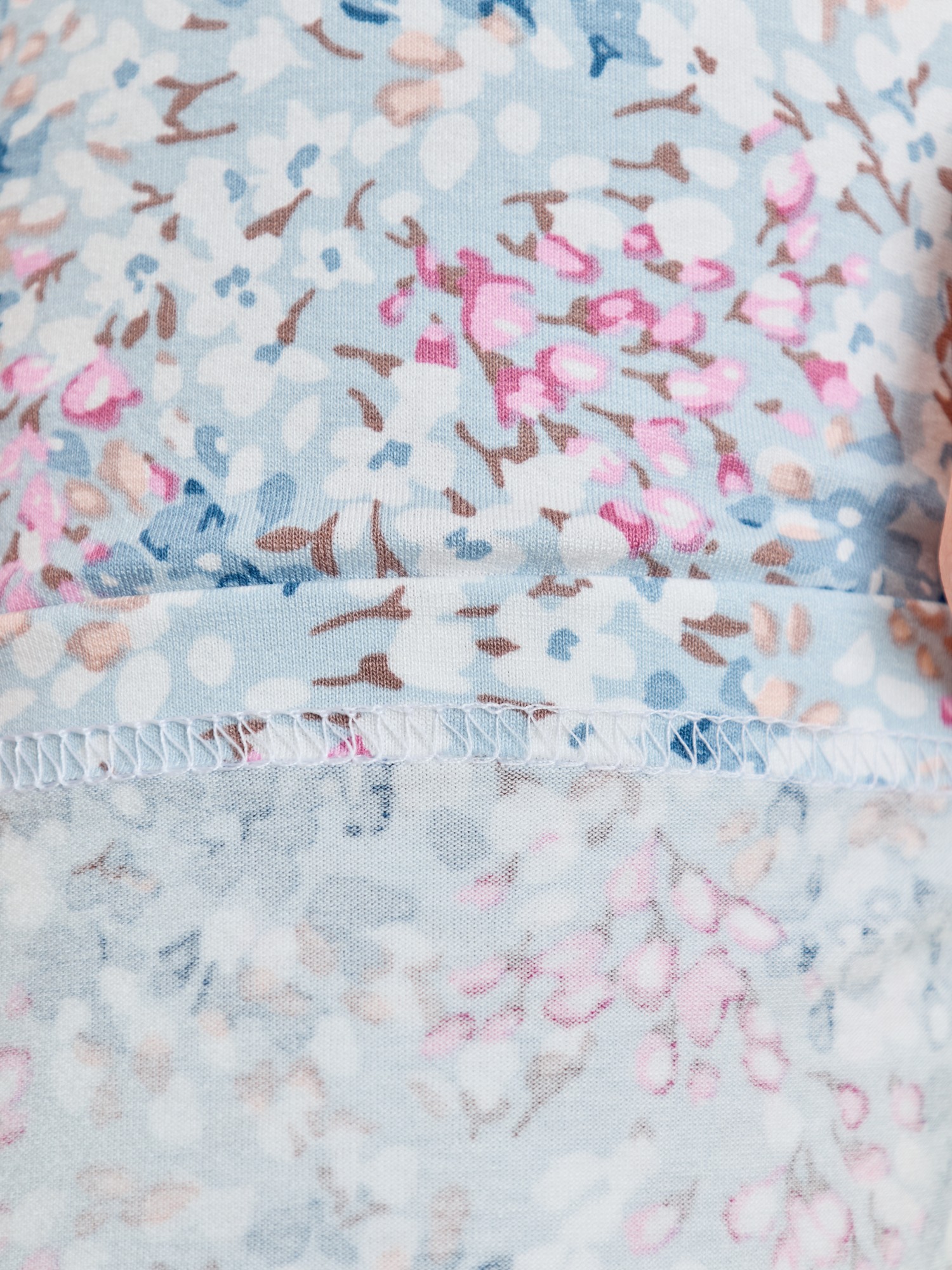 Сорочка женская из вискозного трикотажного плотна с набивным рисунком, свободного покроя, расширенная книзу, с короткими цельнокроеными рукавами и горловиной овальной формы, окантованными основным материалом. По центру горловины переда выполнена сборка.