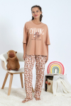 Пижама женская из трикотажного полотна «кашкорсе» с набивным рисунком, состоящая из футболки и брюк.Футболка - классического покроя с углубленной формой горловины, обработанной эластичной тесьмой с фасонным краем и цельнокроеными рукавами.Брюки – длинные, свободные, с эластичной тесьмой по талии.