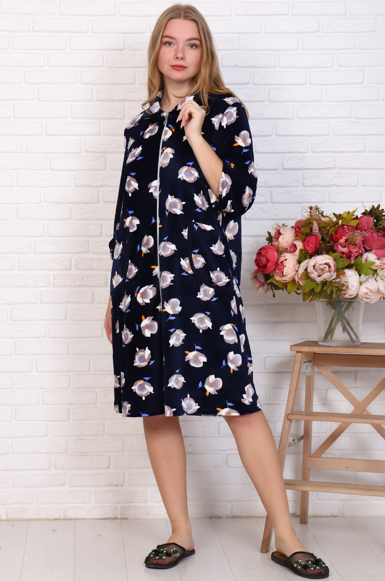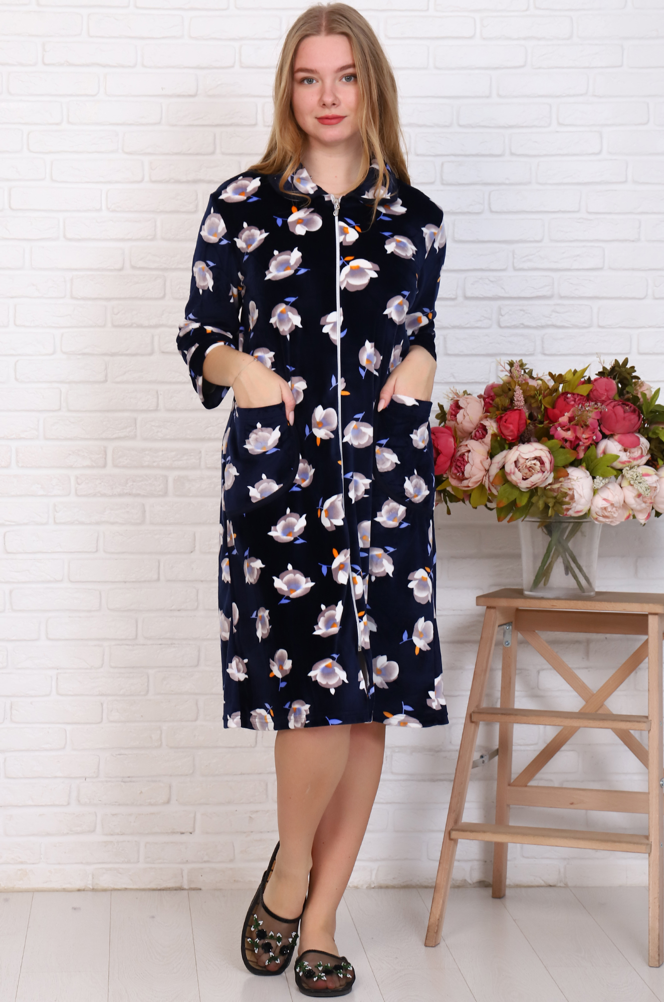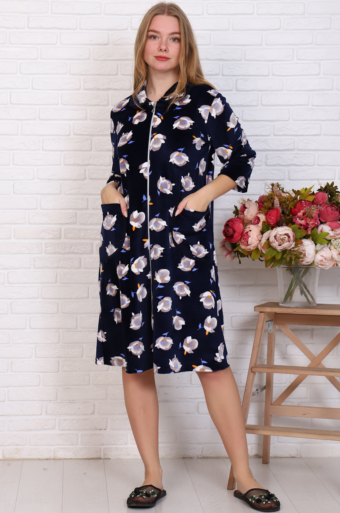 Мягкий, уютный велюровый халатик на молнии. Модель прямого кроя, с отложным воротником, рукав 3/4 на свободном манжете, удобные накладные карманы.