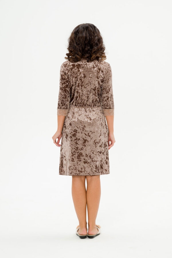 Цвет: кофейный Домашний халат на запах из бархата, рукав 3/4 декорирован кружевом. Приятный к телу, создает красивый и утонченный образ.Красивые и завораживающие переливы ворса придают шикарный вид изделию