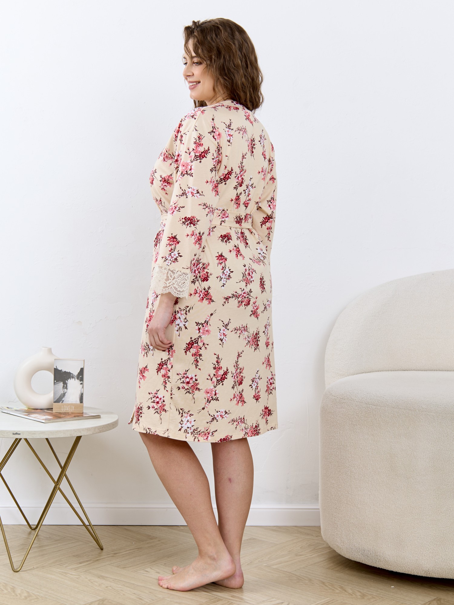 Халат женский из трикотажного полотна «кулирка» с набивным рисунком, на запахе, с втачными длинными рукавами, съемным поясам, продетым в две шлевки, вставленные в боковые швы на уровне линии талии. На правой полочке на уровне бедер – накладной карман прямоугольной формы. Борта и горловина обработаны притачной планкой. Верхний срез кармана и нижние срезы рукавов отделаны кружевом.