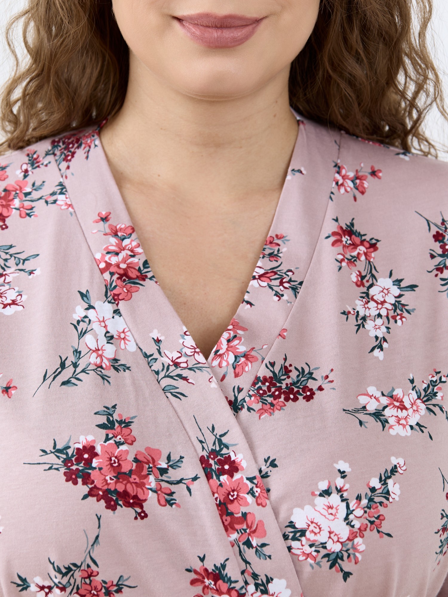 Халат женский из трикотажного полотна «кулирка» с набивным рисунком, на запахе, с втачными длинными рукавами, съемным поясам, продетым в две шлевки, вставленные в боковые швы на уровне линии талии. На правой полочке на уровне бедер – накладной карман прямоугольной формы. Борта и горловина обработаны притачной планкой. Верхний срез кармана и нижние срезы рукавов отделаны кружевом.