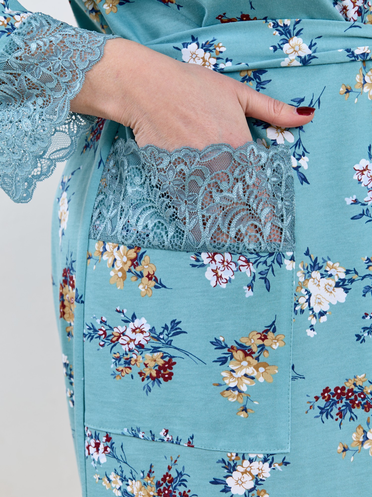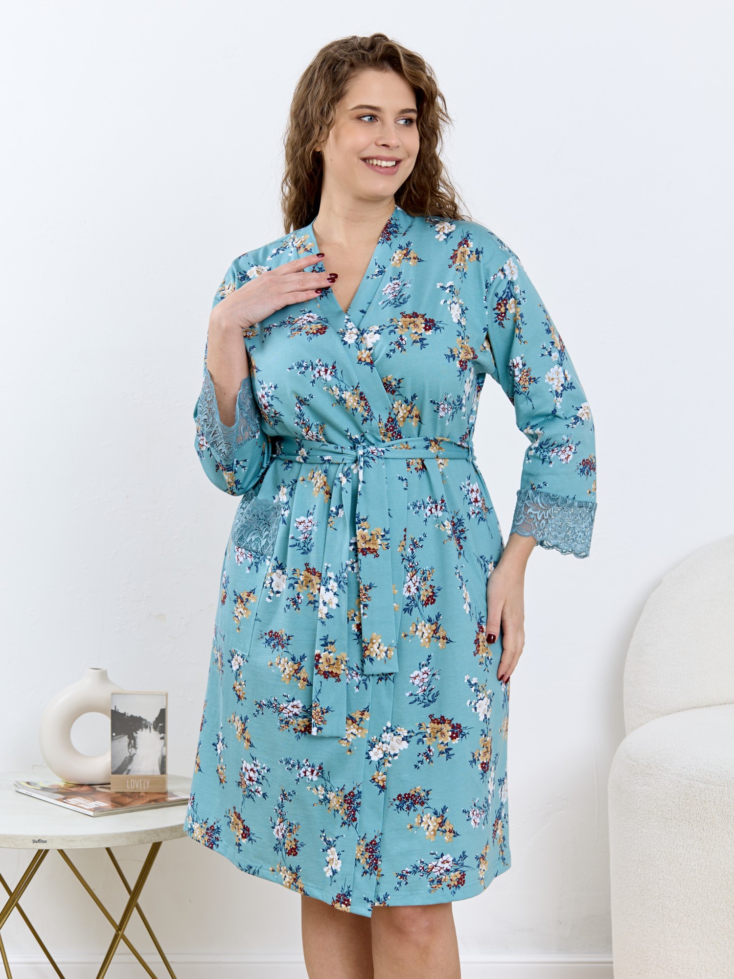 Халат женский из трикотажного полотна «кулирка» с набивным рисунком, на запахе, с втачными длинными рукавами, съемным поясам, продетым в две шлевки, вставленные в боковые швы на уровне линии талии. На правой полочке на уровне бедер – накладной карман прямоугольной формы. Борта и горловина обработаны притачной планкой. Верхний срез кармана и нижние срезы рукавов отделаны кружевом.