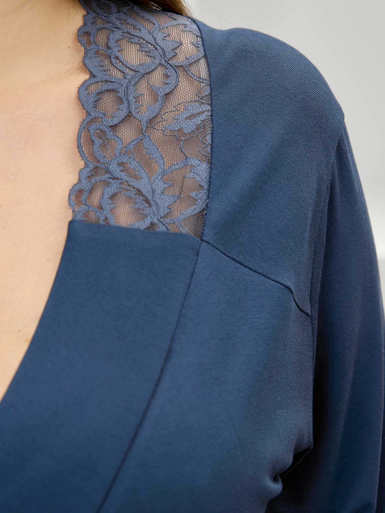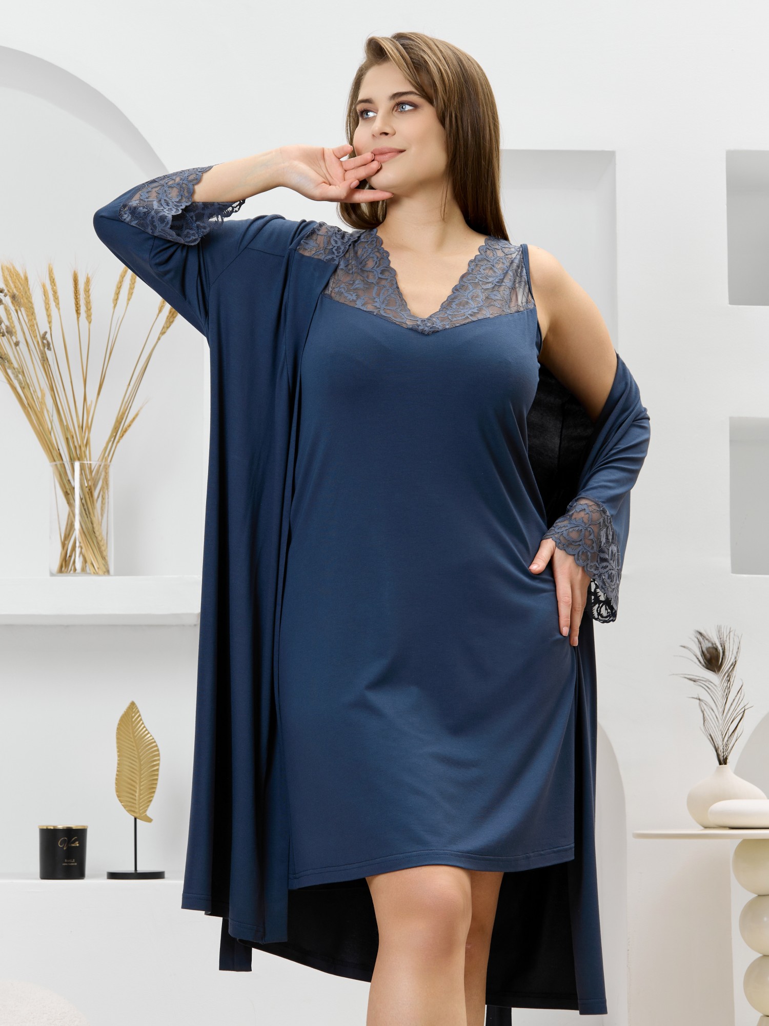 Халат из гладкокрашеного трикотажного вискозного полотна, на запахе, с втачными рукавами 3/4 длины, кружевными манжетами, притачной планкой по бортовым срезам и съемным поясом, продетым через две шлевки в боковых швах. Спинка с кружевной притачной кокеткой - V-образной формы, бортовая планка с кружевными вставками, переходящими на полочку.