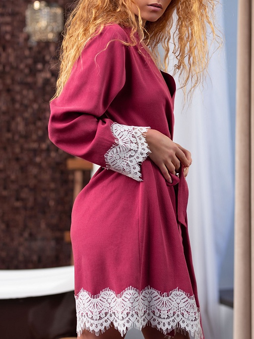 Элегантный и роскошный домашний халат, с запахом, на поясе. Выполнен из необыкновенной ткани на основе волокна тенсел, которое по своим свойствам напоминает натуральный шелк: воздухопроницаемое, мягкое на ощупь, освежает и дает ощущение прохлады и комфорта. Ткань с модным эффектом выцветшей поверхности украшена богатым кружевом молочного цвета. Это сочетание выглядит необыкновенно свежо и актуально. Такой великолепный халатик станет отличным подарком как себе, так и близкому дорогому человеку.