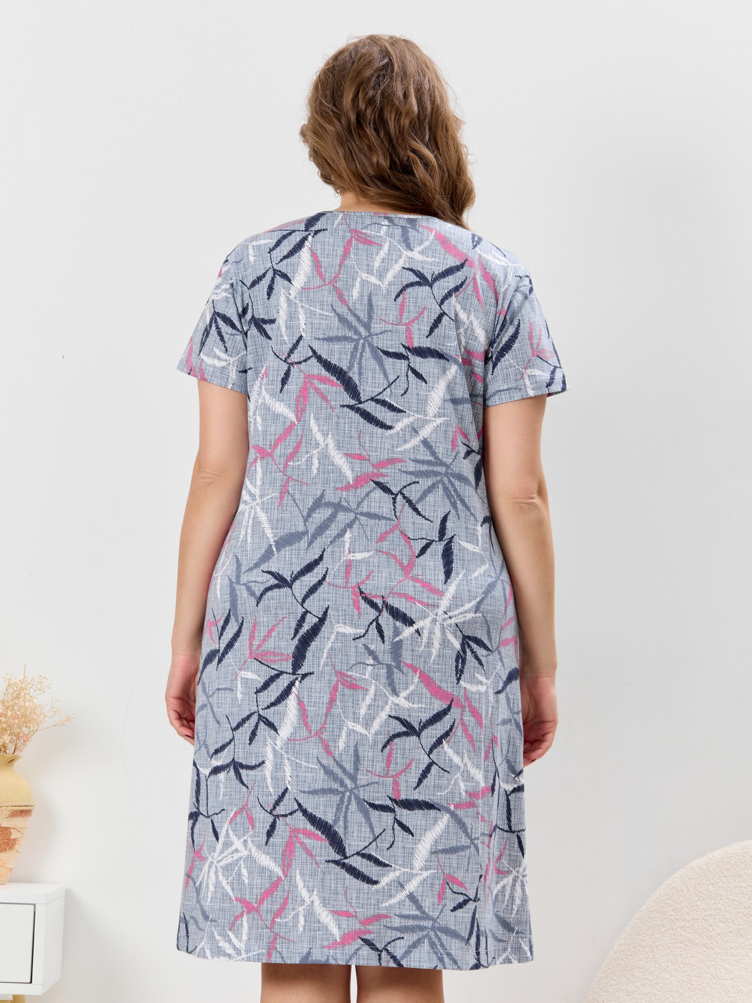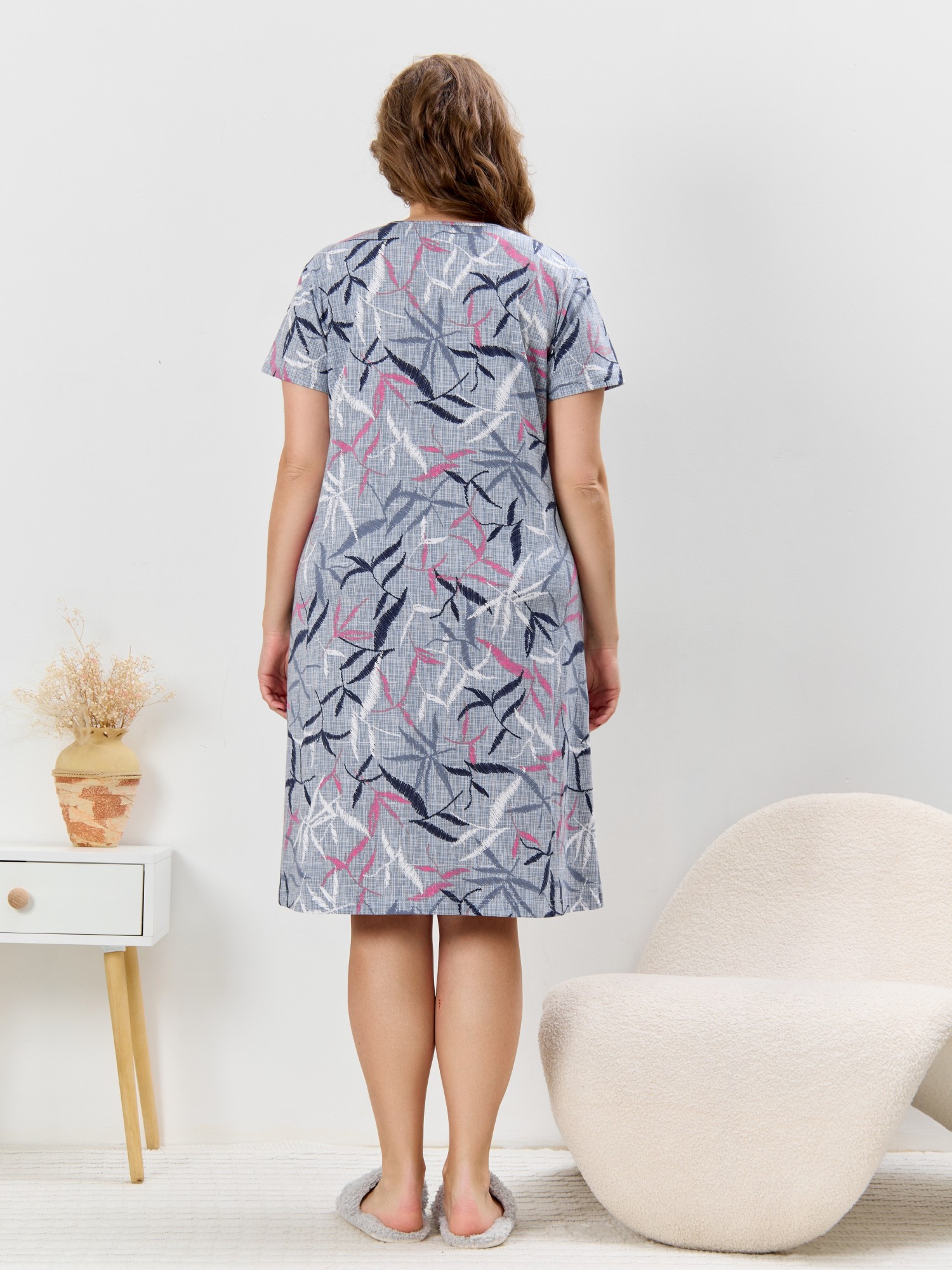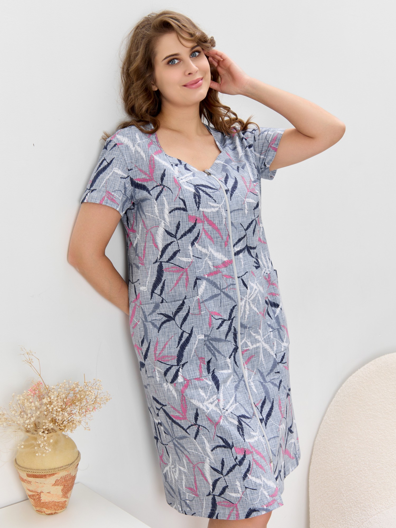 Халат женский из трикотажного полотна «кулирка» с набивным рисунком, прямого силуэта, с короткими втачными рукавами, горловиной фигурной формы, двумя накладными карманами на уровне бедер и центральной бортовой застежкой на тесьму «молния». Полочка – с рельефными швами, выходящими из горловины. Нижние срезы горловины обработаны притачными планками. Остальная часть горловины окантована основным материалом.