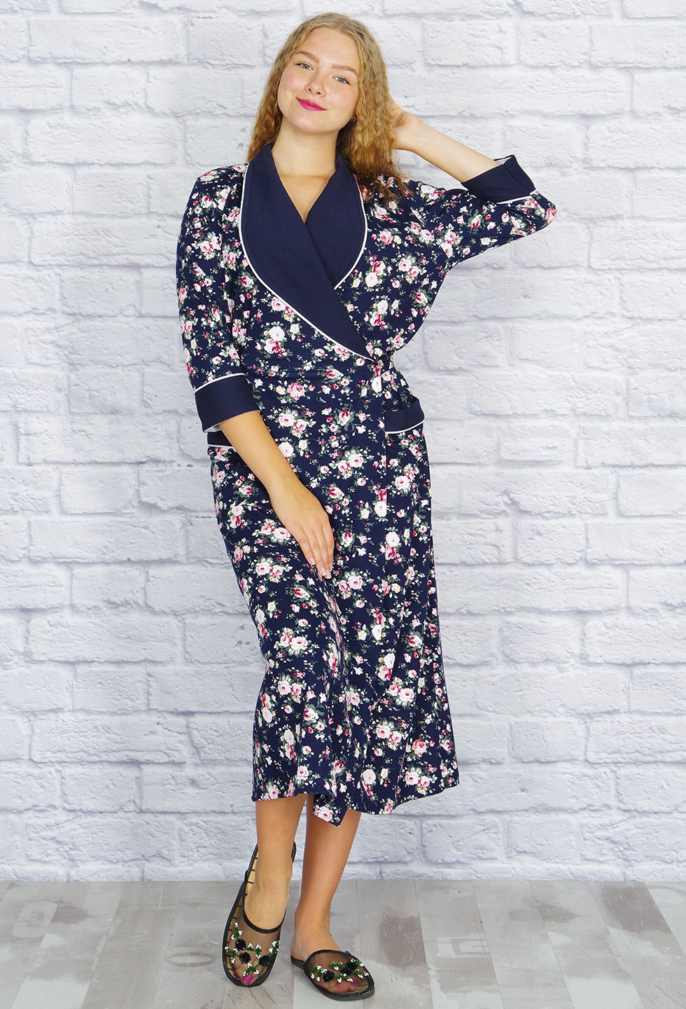 Халат на запах с воротником-шалька и удобными карманами, рукав 3/4, комфортная длина.
