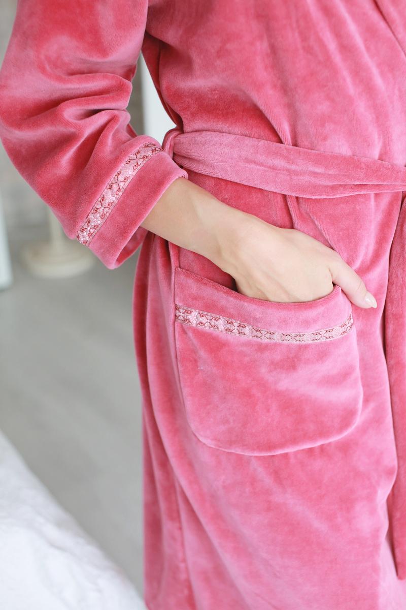 Велюровый женский халат Клеопатра для дома и отдыха. После трудного и продуктивного дня приятно надевать халат Клеопатра и погрузиться в мир блаженства и комфорта. Это роскошно после ванны или домашних СПА процедур окунуться в теплый, мягкий и красивый халатик Клеопатра и почувствовать себя настоящей царицей. Приятный к телу велюр, кармашки, поясок, удобная длина рукава, а еще красивая отделка в виде канта с тематическим узором придает образу шарм и очарование
