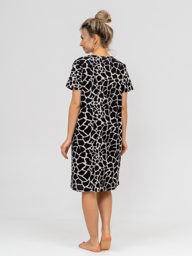Модель прямая, средней длины, с коротким рукавом и удобными накладными карманами.