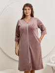 Халат из гладкокрашеного трикотажного полотна «велсофт», прямого силуэта, с длинными втачными рукавами, карманами в боковых швах, стояче-отложным воротником «стойка», центральной бортовой застежкой на тесьму «молния», съемным поясом, продетым через две шлевки в боковых швах и вышивкой на полочке. Рукава – с притачными манжетами.