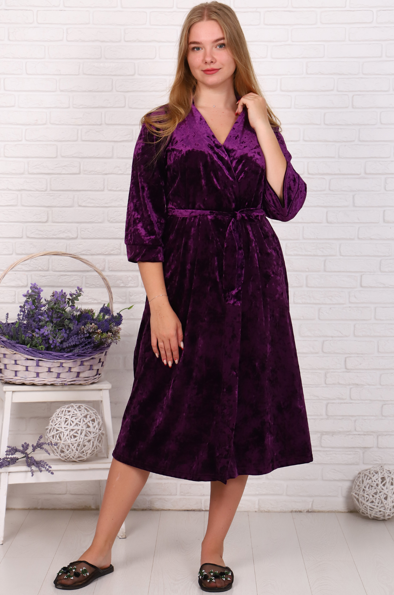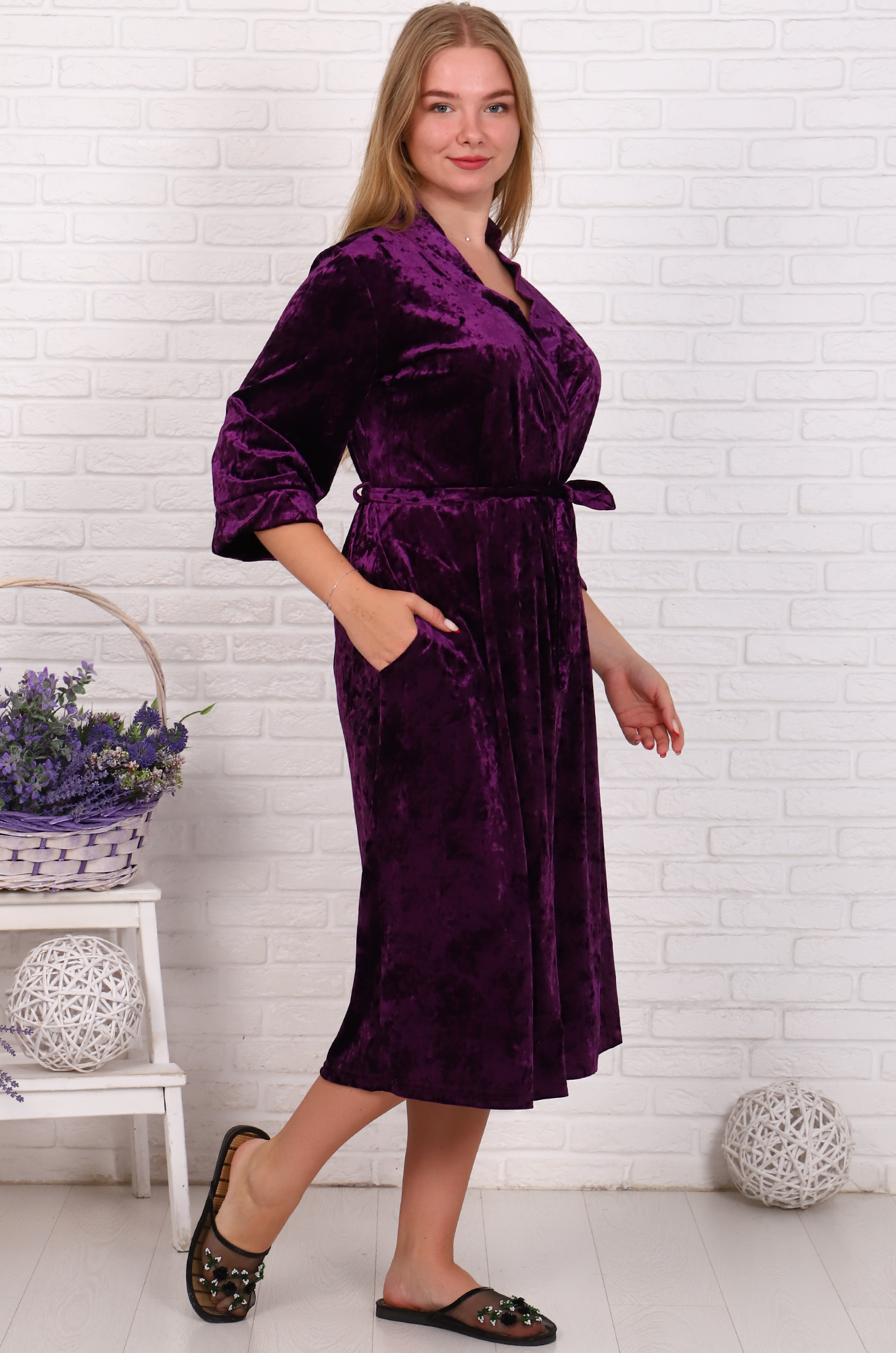 Шикарный халат из "королевского" бархата предназначен для истинных леди! Модель на запах, с боковыми карманами, удобный рукав 3/4. Ткань -  лёгкий, шелковистый бархат.