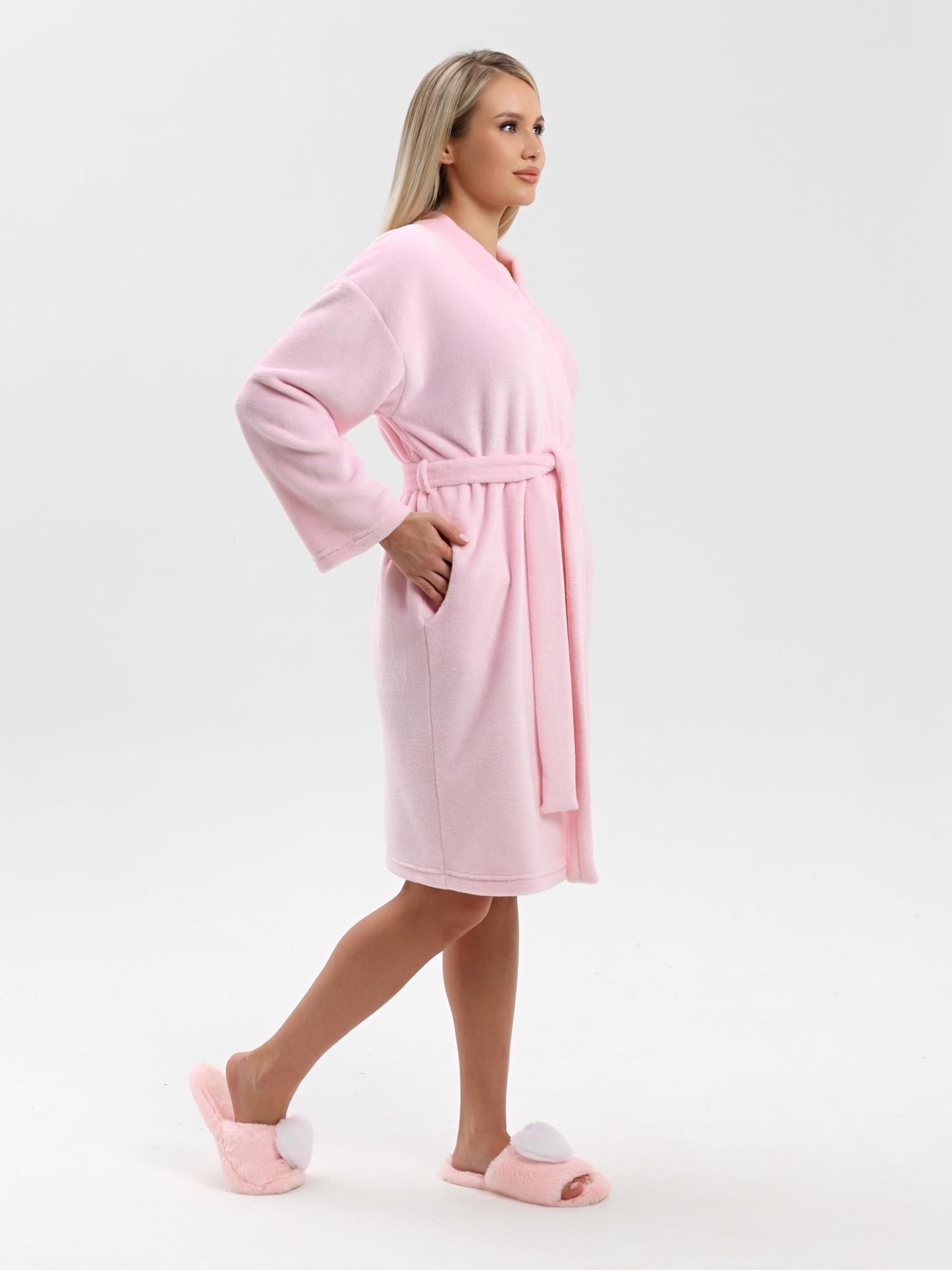 Халат молодежный из гладкокрашенного тканого полотна «велсофт», свободного покроя на «запахе», с длинными втачными рукавами, с притачной планкой по горловине и бортовым срезам, карманами в боковых швах, и декоративной нашивкой на спинке. Съемный завязывающийся пояс, продет в две шлевки в боковых швах на уровне талии.