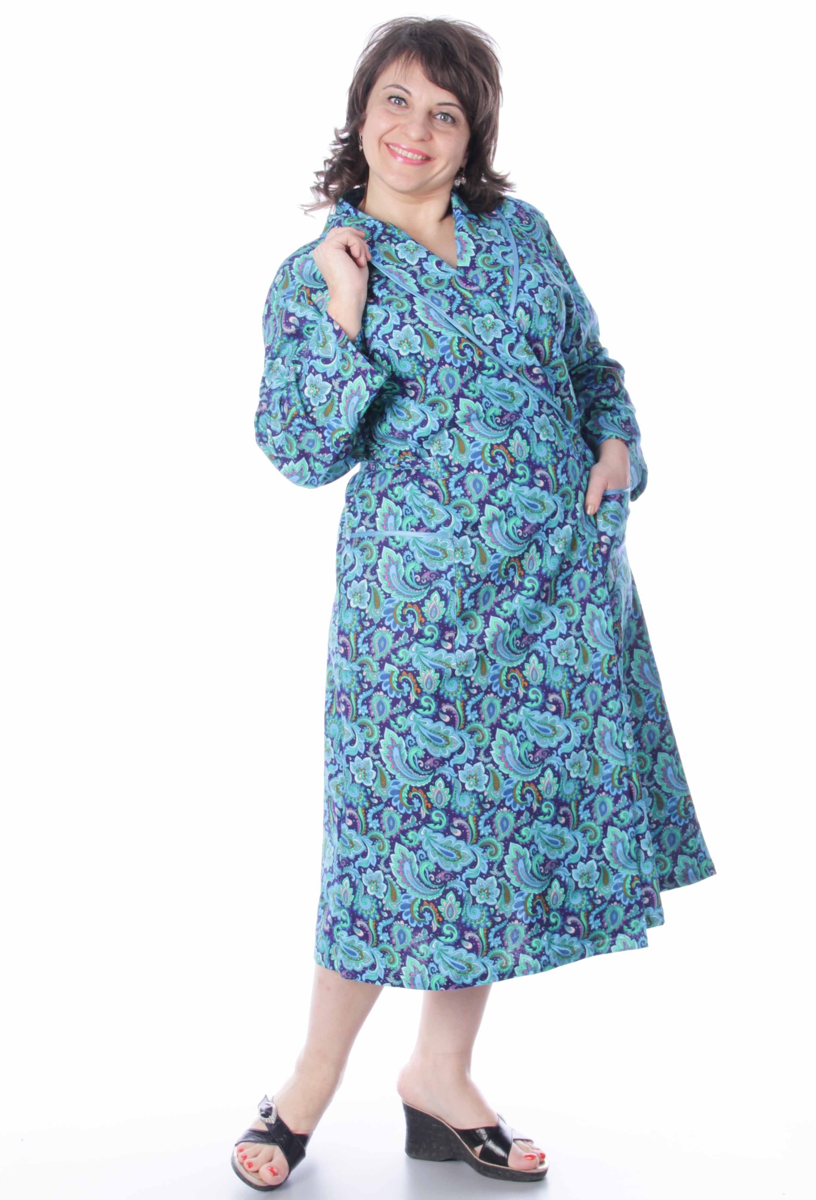 Классический фланелевый халатик на запах с удобными боковыми карманами и длинными рукавами.